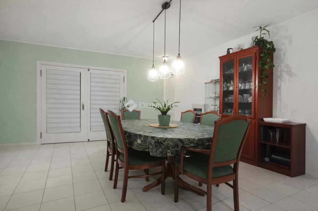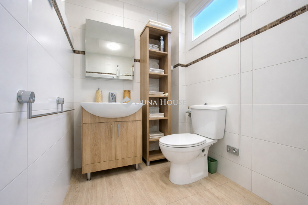 Az alsó szinten tágas nappali, ebédlő, amerikai konyha és az egyik fürdőszoba van, mely 2 és fél éve lett felújítva, zuhanykabinos. A nappaliból nyílik egy nagy szoba, melyet eredetileg garázsnak szántak, de végül lakószobaként épült meg, kijárattal a teraszra. Fűtéssel, padlószőnyeggel rendelkezik. Dolgozószobaként és hálószobaként is használható.
