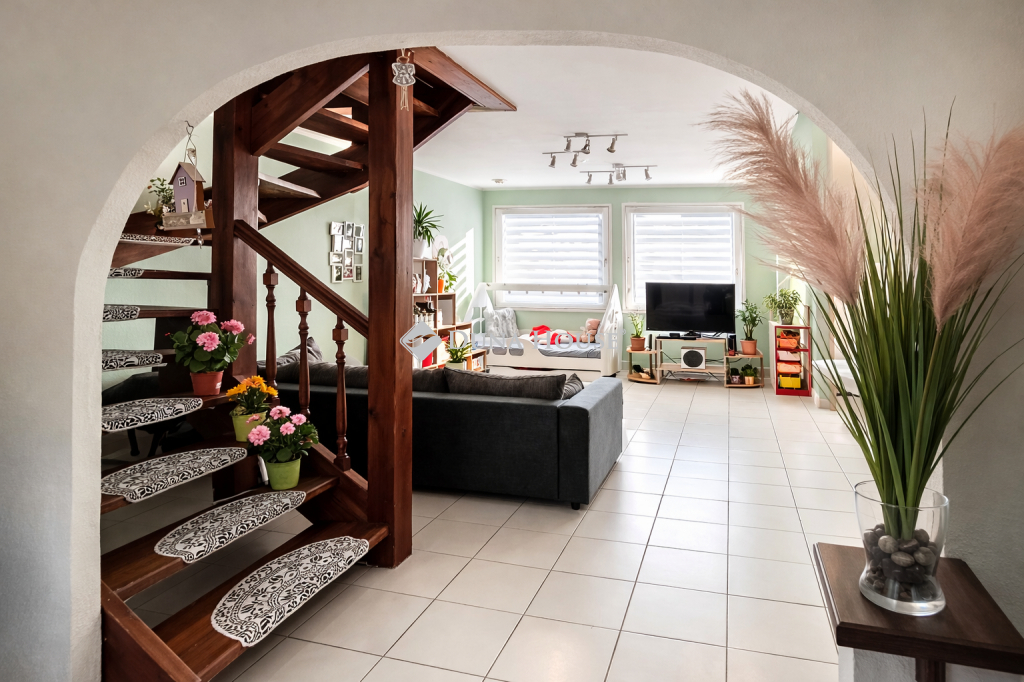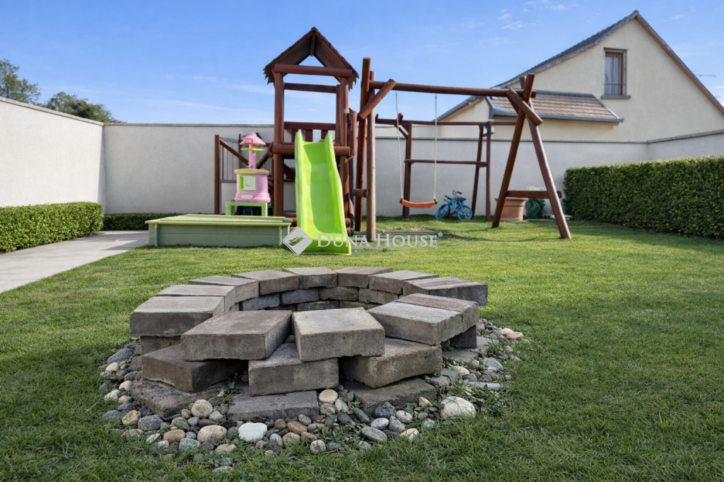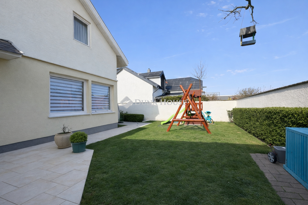 A HÁZ CSENDES ZSÁKUTCÁBAN HELYEZKEDIK EL, Pomáz központi részén található, közvetlen kertkapcsolattal rendelkezik egy hátsó terasszal. A kert ápolt, rendezett, levendula, jázmin, tujasövény, rózsák, díszfák és egy bográcsoló hely teszik igazán élvezhetővé. Az öntözést egy FÚRT KÚT biztosítja.