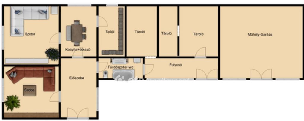 -a belső helyiségben : előszoba , 2 szoba , konyha+étkező , spájz , fürdőszoba +wc található.