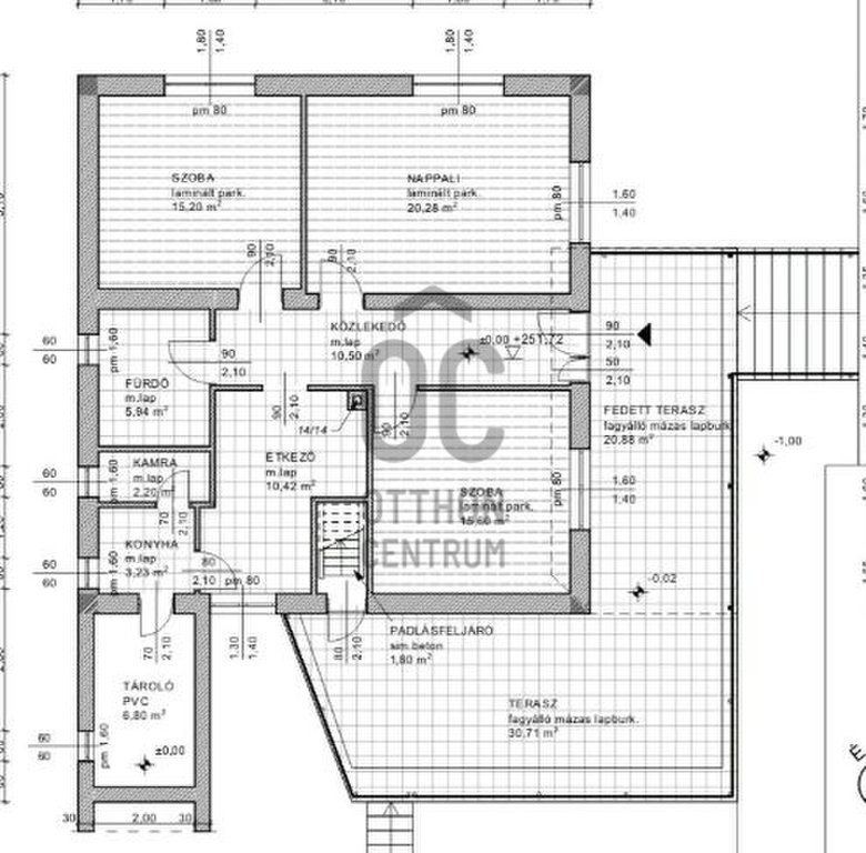 A ház déli oldalán 52 nm terasz található, ebből a bejáratnál 21 nm-es rész fedett.