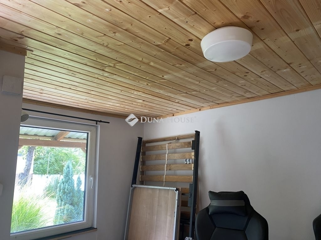 Kert végében fa szerkezetű, trapézlemez fedéses, egy légterű vendégház, nagy terasszal és tárolókkal.