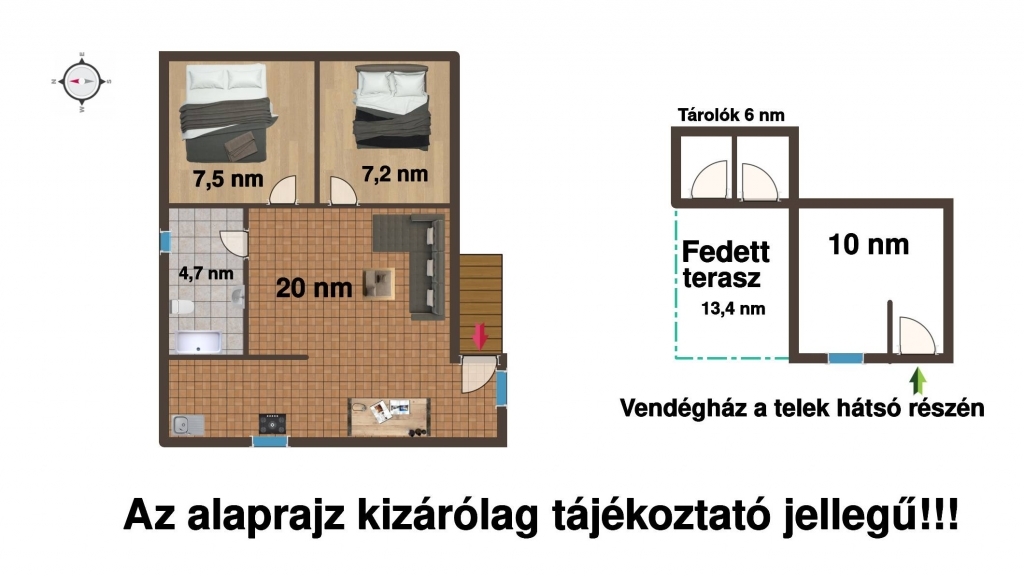 Fő ingatlan elrendezése: lépcsős, burkolt kis teraszról lépünk az amerikai konyhás nappaliba, melyből nyílik két háló szoba és a zuhanyzós fürdő toalettel.