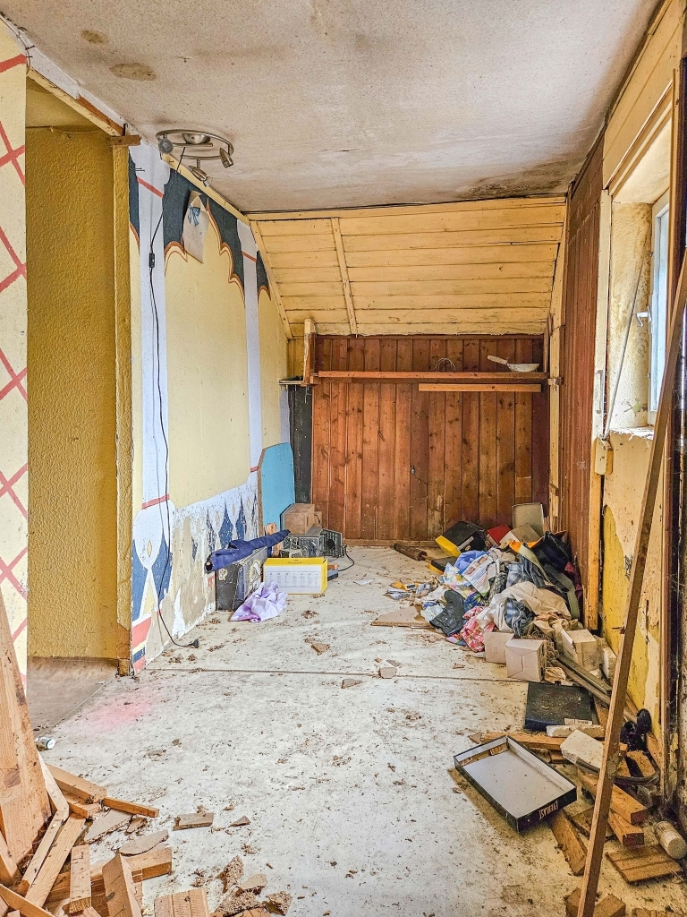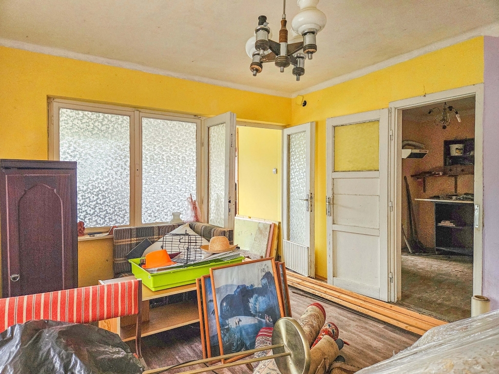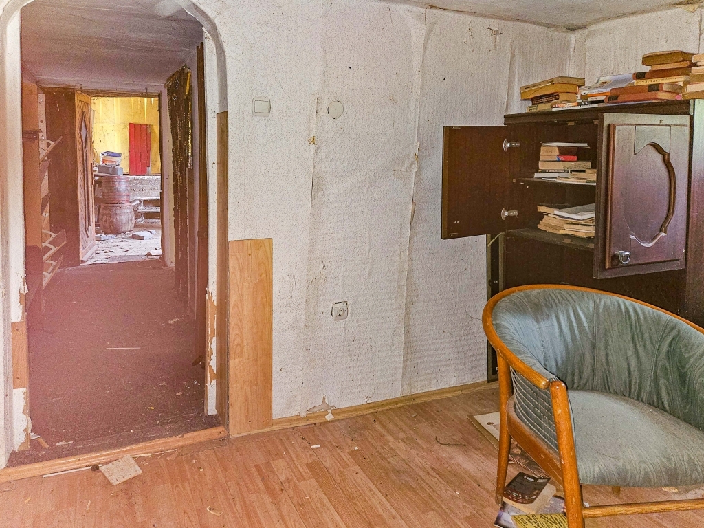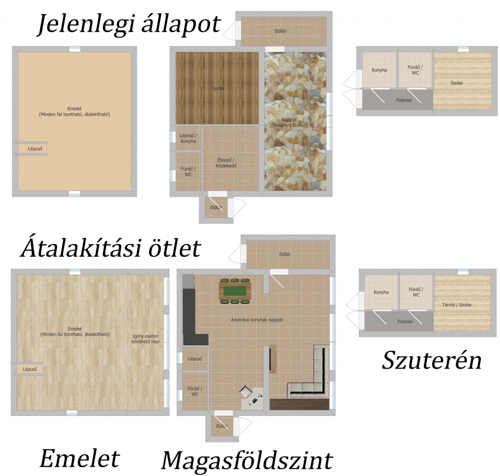 Magasföldszint: az eredeti ház ki lett bővítve. A nappali jelenleg egy könnyűszerkezettel beépített terasz. Ez újrafalazható, átalakítható.