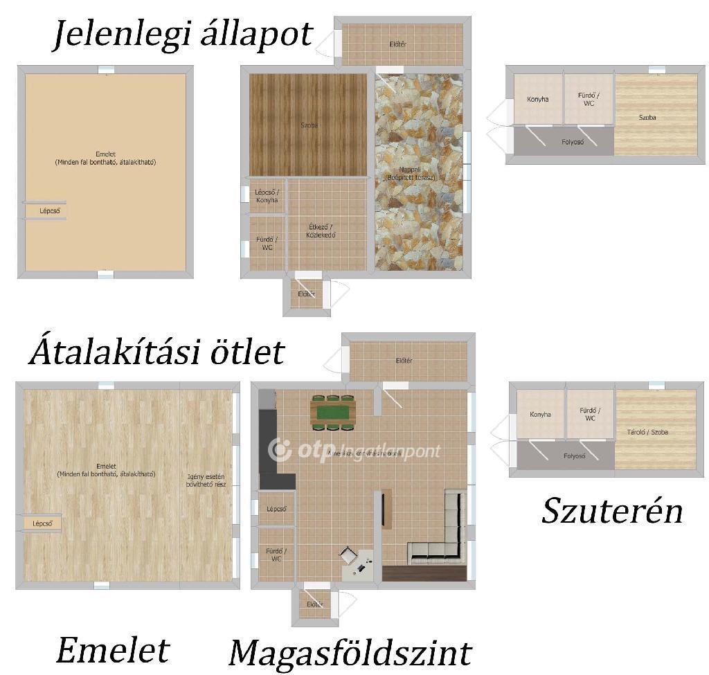 Magasföldszint: az eredeti ház ki lett bővítve. A nappali jelenleg egy könnyűszerkezettel beépített terasz. Ez újrafalazható, átalakítható.
