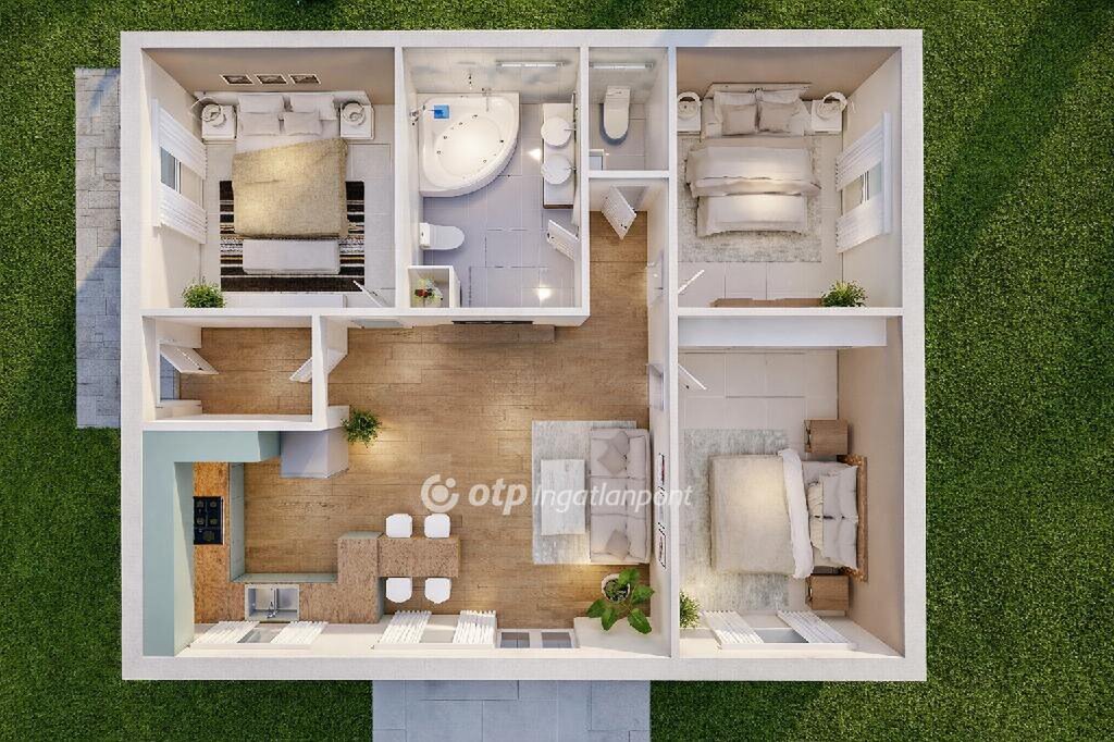 A 400 négyzetméteres telken elhelyezkedő, nettó 82 négyzetméteres ház fiatalos, praktikus elrendezésű, amely kényelmet és funkcionalitást kínál. Az ingatlanban három hálószoba, egy tágas amerikai konyhás nappali és étkező, egy fürdőszoba, valamint egy külön WC kapott helyet.