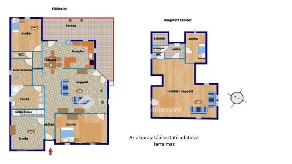 A felső szinten nappali, melybe beözönlik a napfény, hálószoba, zuhanyzó, WC és szauna szolgálja a kényelmet. A felső szint ?dühöngő?-ként funkcionálhat a stresszes mindennapok kipihenésére, hiszen a jelenlegi tulajdonosok a gyermekük részére hangszigeteltették, mivel hangszeren gyakorolt évekig, így nem zavarta a szomszédokat véletlenül sem.