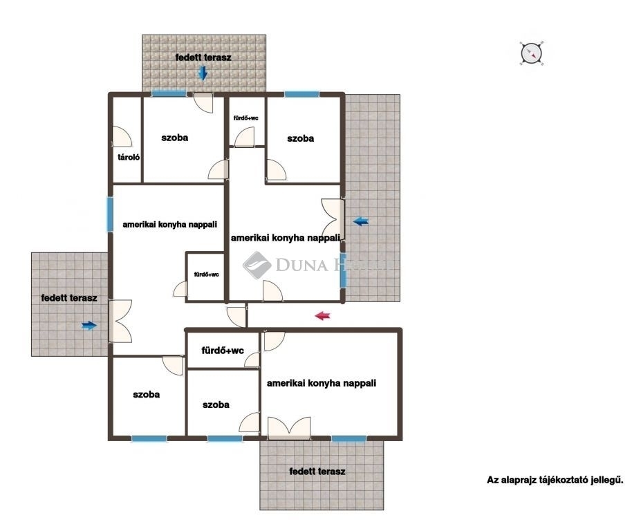A fedett terasz, minőségi burkolatok, redőnyök és szúnyoghálók tovább növelik az értékét.