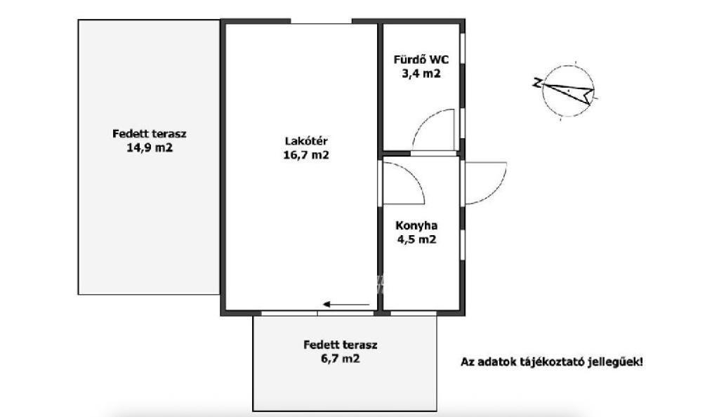 A különálló, egyszintes épület 25 nm-s lakóteret kínál, két fedett terasszal.