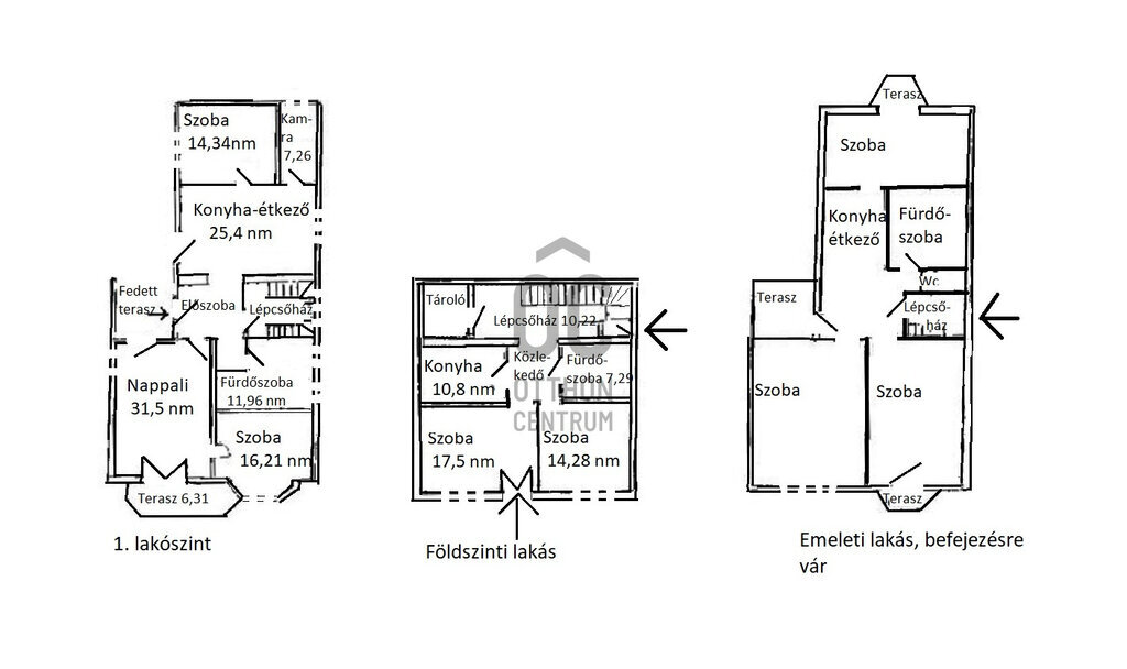 Az emeleti lakás befejezésre vár, itt 3 szoba, egy konyha-étkező terasz kapcsolattal, egy fürdőszoba és egy külön mellékhelyiség található.