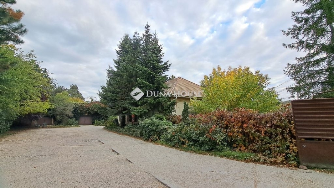 A saroktelken álló épület az utcafronttól távolabb, a telek közepén található, így védve van a zajtól és a kíváncsi tekintetektől. Magas fenyők, ciprusok és dús növényzet ölelik körbe, megteremtve a zöld, békés életteret.