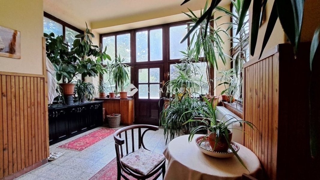 A bejárat egy világos, üvegezett télikerten keresztül vezet a tágas amerikai konyhás nappaliba, ahol a parketta és a nagy belmagasság otthonos eleganciát sugároz.
