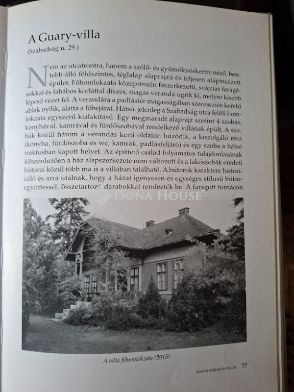 A telek 1242 m², rajta egy nettó 92 m² alapterületű villa, beépíthető tetőtérrel. Hozzá tartozik még egy 18 m²-es fedett terasz és egy 49 m² pince. A villa déli fele eladó. A ház melegét két álló cserépkályha biztosította, de bevezették a gázt is és gázkonvektorral is lehet fűteni az épületet. A villában 2 db 31 m² szoba található, illetve egy étkezős nappali, konyha, fürdő WC-vel.
