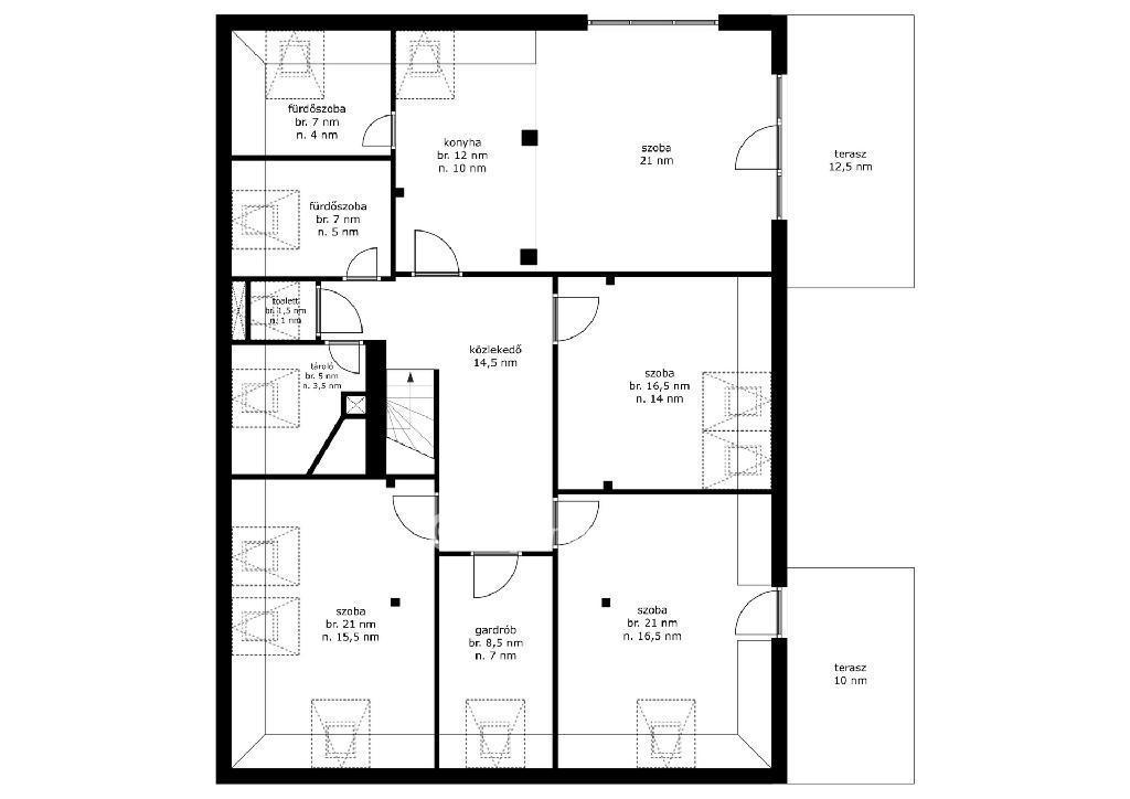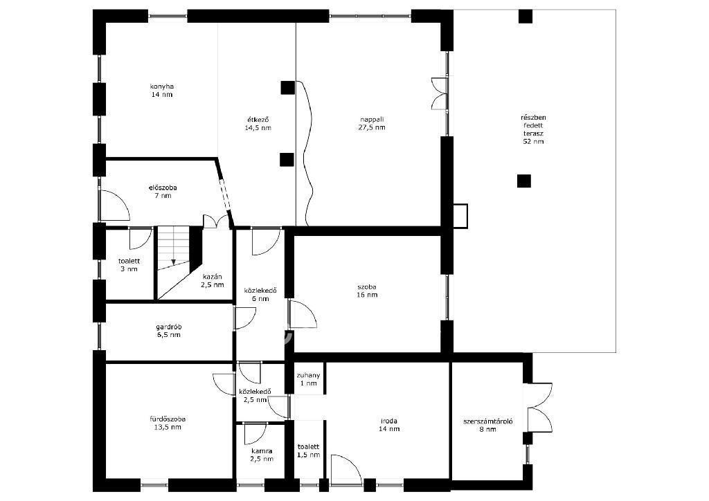 Az alaprajz kiválóan szemlélteti a helyiségek logikus elosztását és nagy méretű kialakítását.