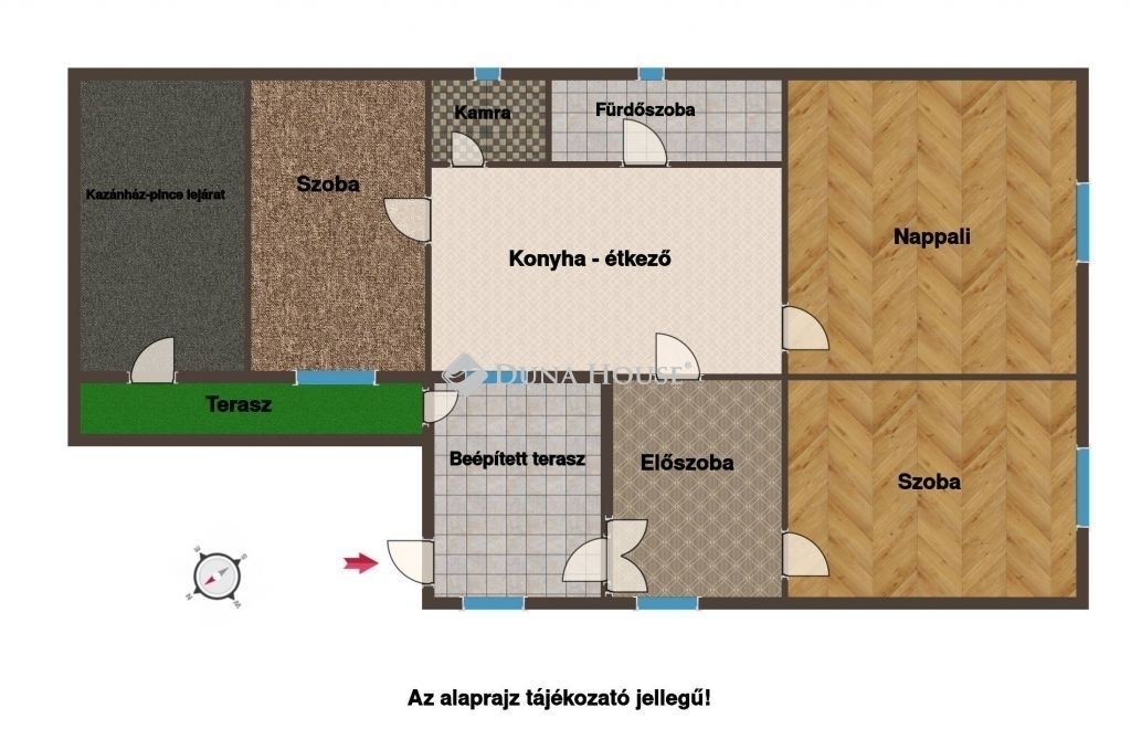 Belső tereit a praktikusság és az otthonosság jellemzi: 2 szoba és nappali, egybenyitott konyhaétkező, fürdőszoba WC-vel, kamra, valamint egy beépített terasz, ahol jólesik megállni egy reggeli kávéra vagy egy csendes esti beszélgetésre.