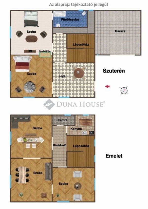 Az alsó részen szuterénes kialakítással, 2.2 m-es belmagassággal kettő szoba, fürdő, hall , míg az emeleten három szoba, konyha, kamra található.