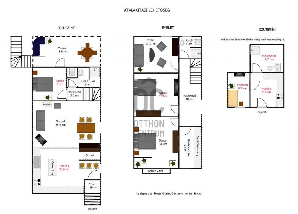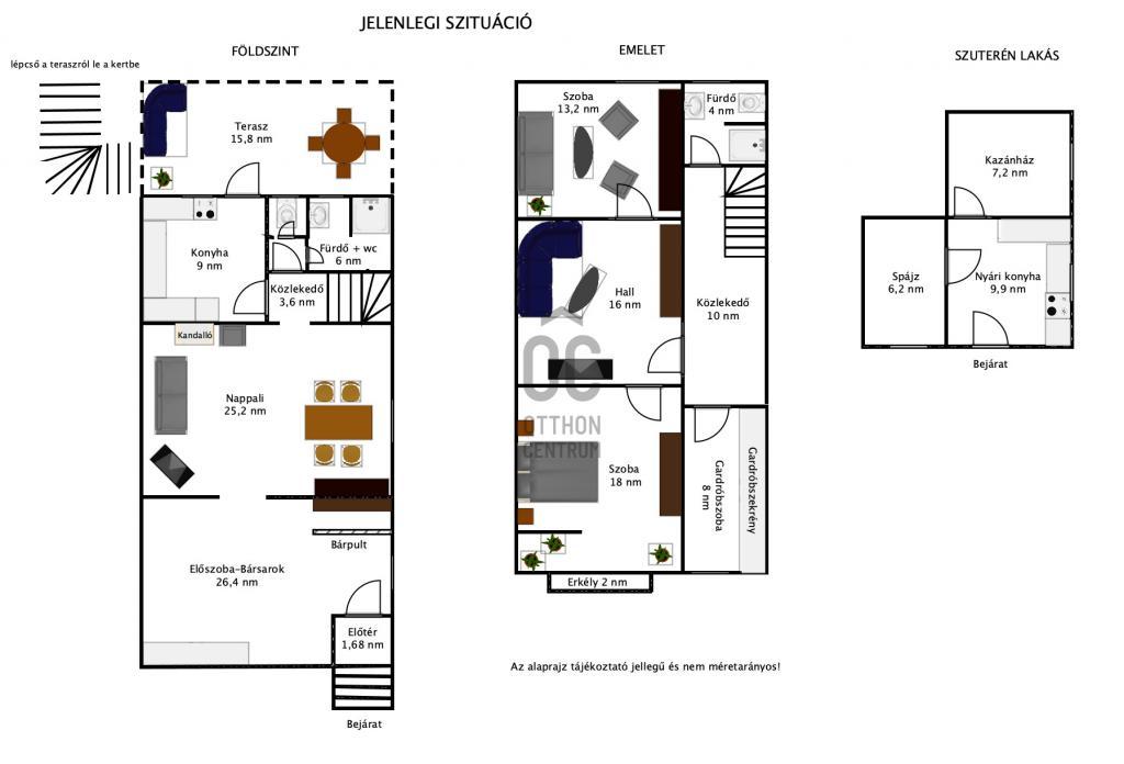 - a háznak két emelete van és a ház fele alatt van még egy szuterén szint, ami jelenleg nyári konyhaként, mosókonyhaként és kazánházként funkcionál