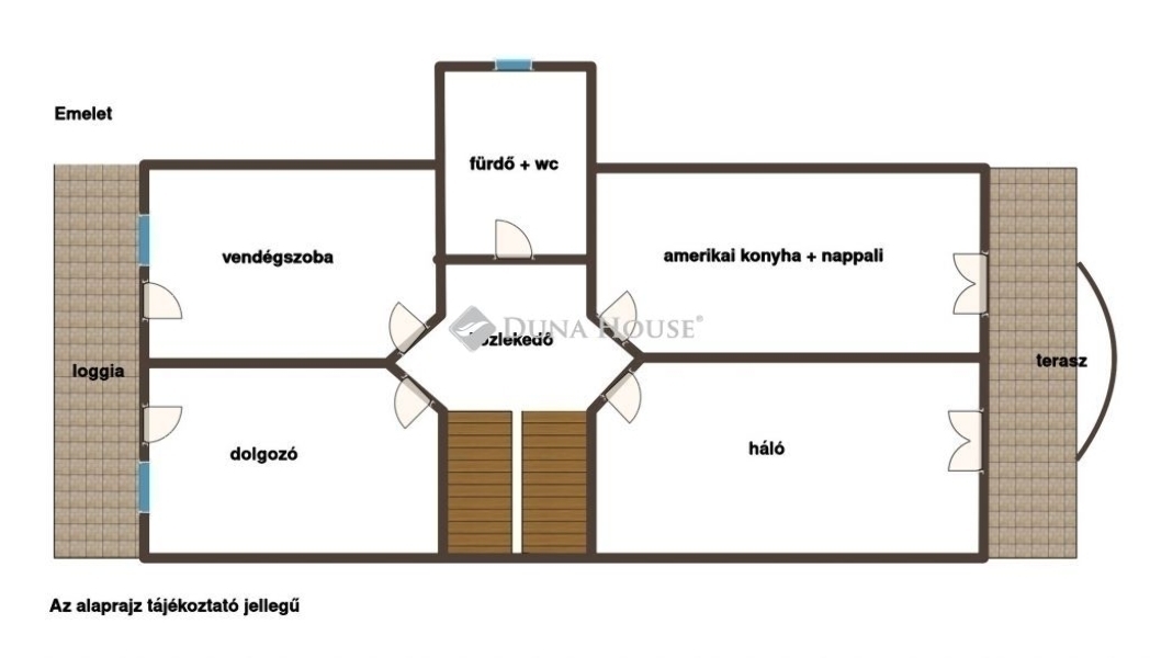 A felső szintre igényes lépcső vezet, ahol amerikai konyha + nappali, 3 külön bejáratú szoba és fürdő került kialakításra. A környezettel való kapcsolatot loggia biztosítja, mely a nappaliból és a szobából is megközelíthető.