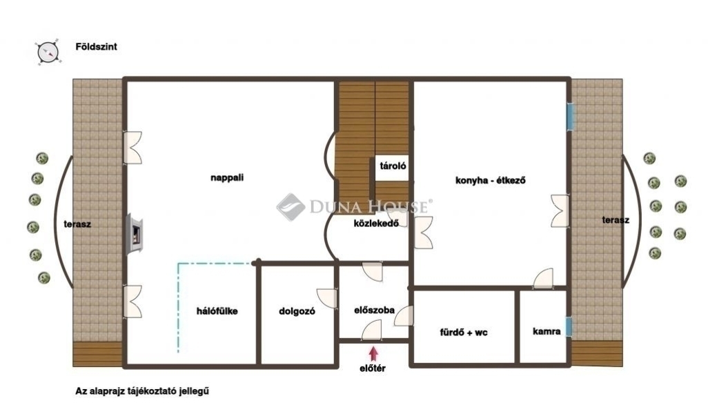 Fő élettér a földszinti hangulatos, jó fényviszonyokkal rendelkező tágas nappali, hangulatát a kandalló növeli amely téli napokon hozzájárulhat az ünnepi hangulat megteremtéséhez. A konyha-étkezőbe minőségi bútor került beépítésre, gépesített. A nappaliból és a konyha-étkezőből a nyílik 1-1 fedett terasz, mely kiválóan alkalmas társasági életre.