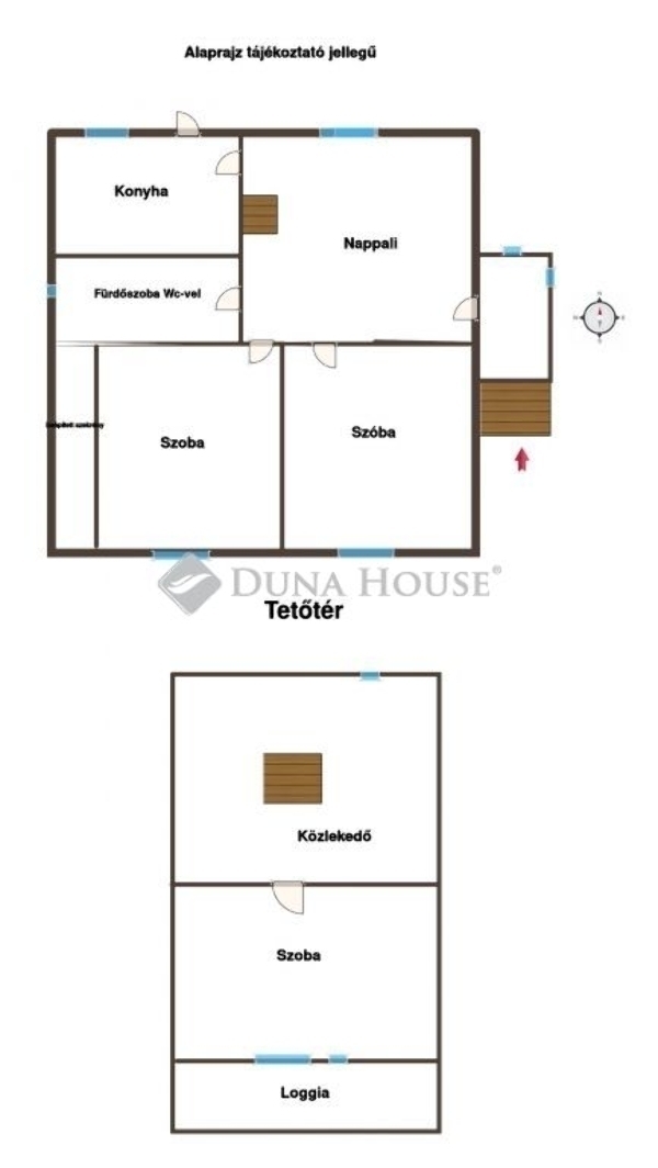 A tetőtérben 1 szoba, közlekedő, lodzsa helyezkedik el.