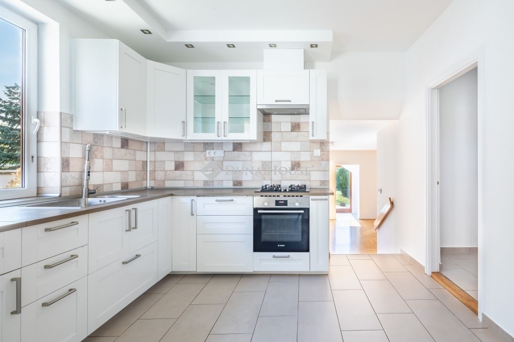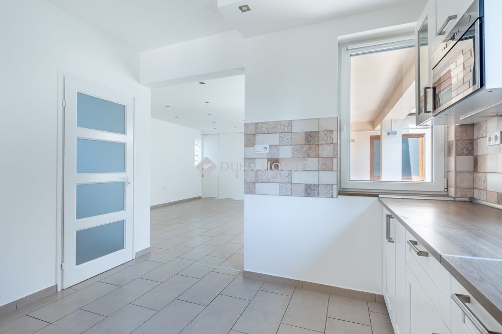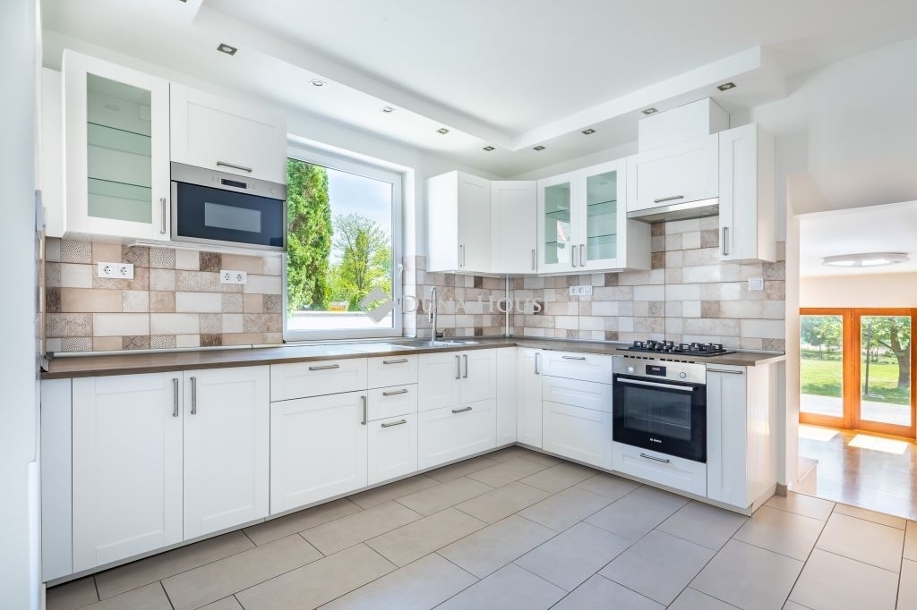 A földszinti konyha gépesített, beépített bútorok találhatóak.