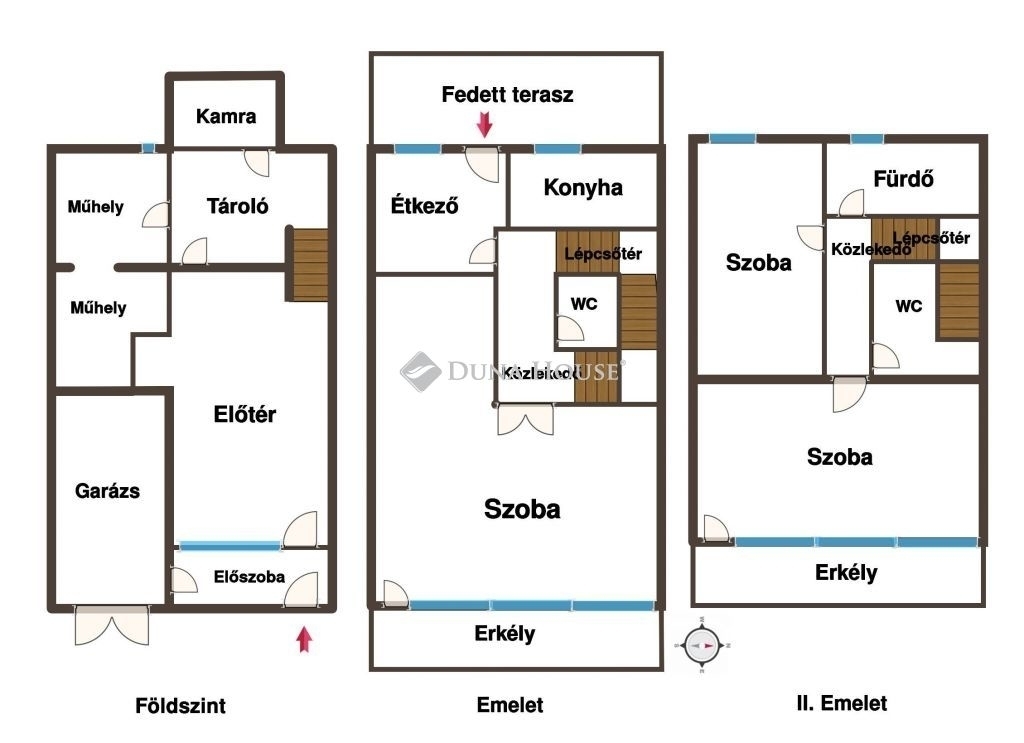 II. emelet: lépcsőtér, közlekedő, Fürdő/wc, szoba, szoba, wc, erkély.