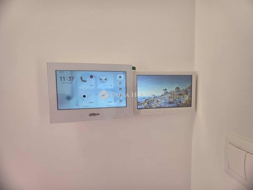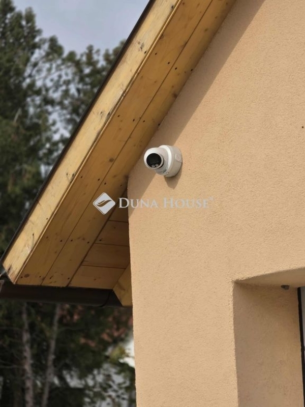 Az ingatlant riasztó- és digitális kamerarendszer védi, a telefonon követhető külső tér ellenőrzésének lehetőségével.