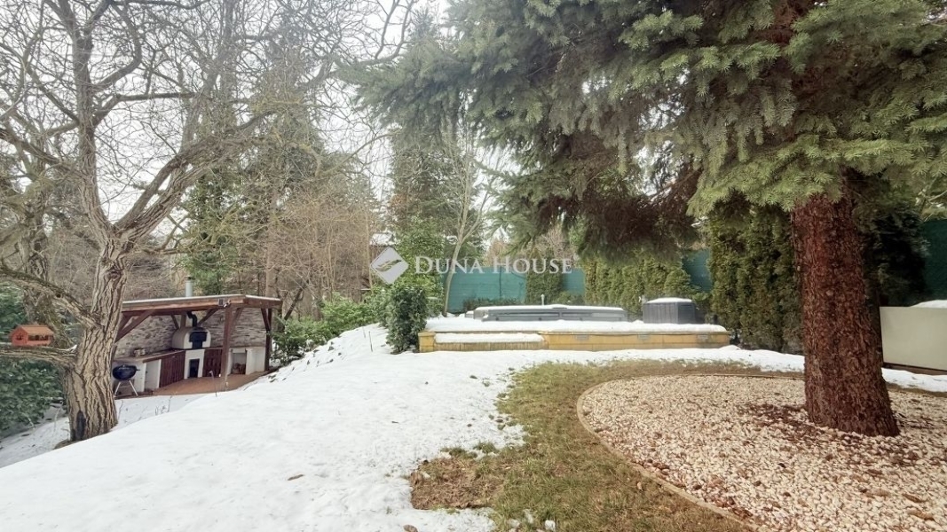 A kert praktikus méretű, gondos kezek tervezték meg minden szegletét. A hátsó kertben helyeztek el egy kültéri, fedett konyhát, kemencével, egy sós vizes, ellenáramoltatóval ellátott medencét. A ház előtt autóbeállót találunk, fedett tárolót, kis játszósarkot.