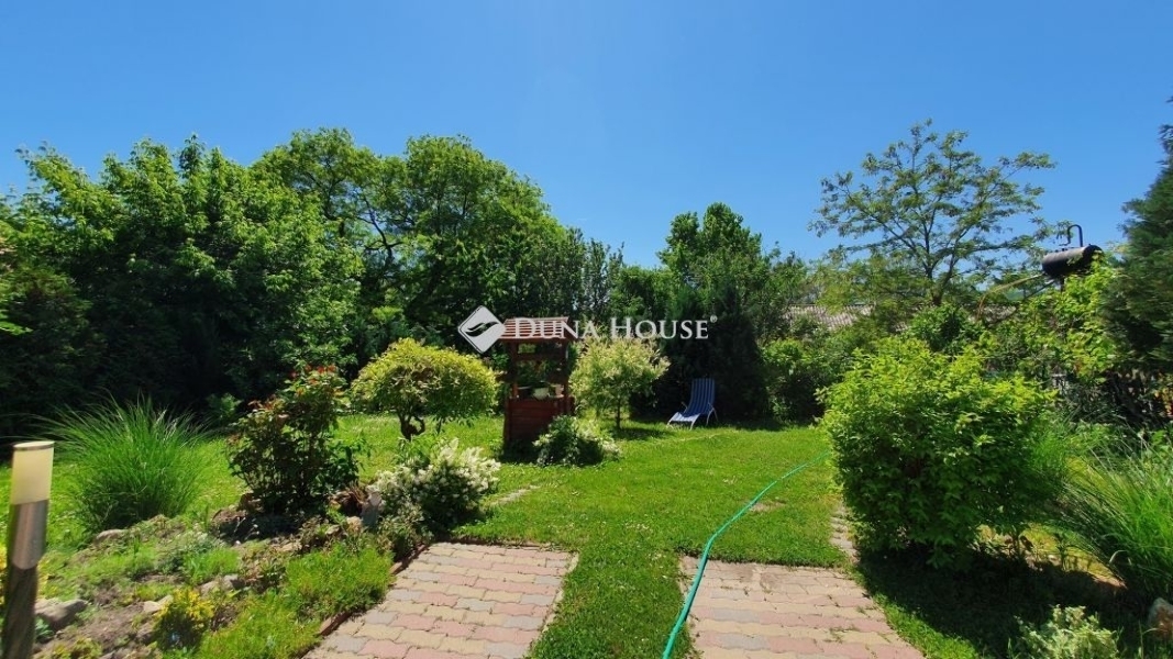 A kert szépen ápolt, dísznövények és termő gyümölcsfák egyaránt megtalálhatók benne. Az emeleti lakásba külső lépcső vezet, így az teljesen külön bejáratú.
