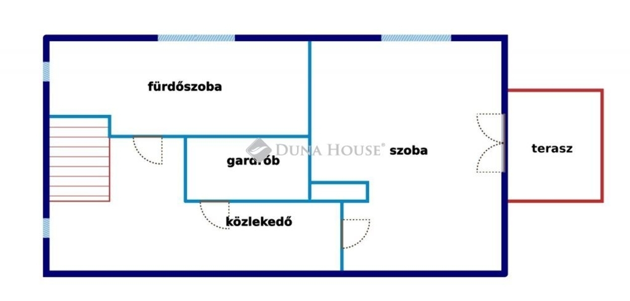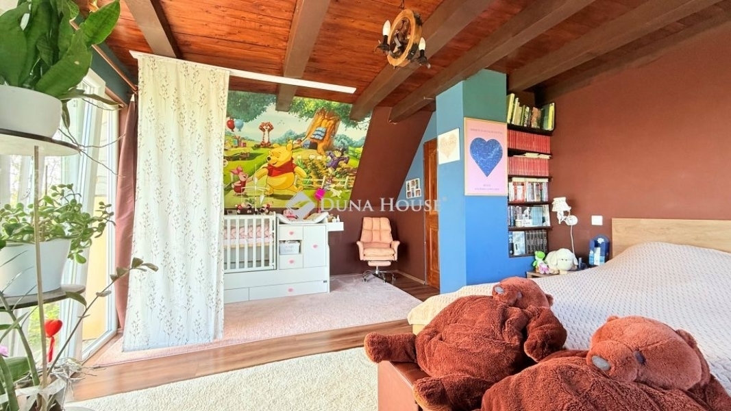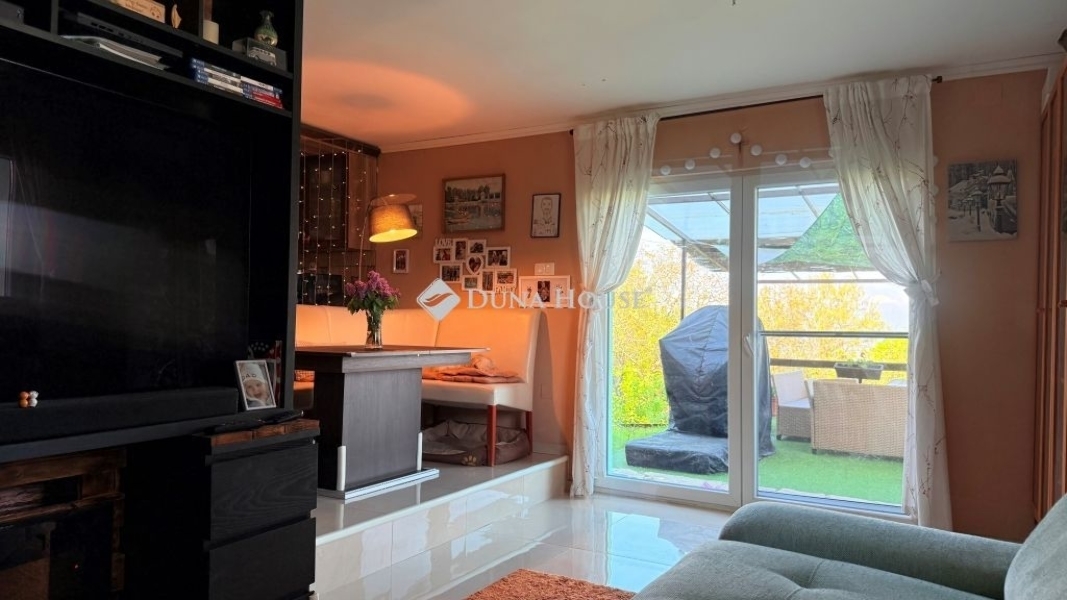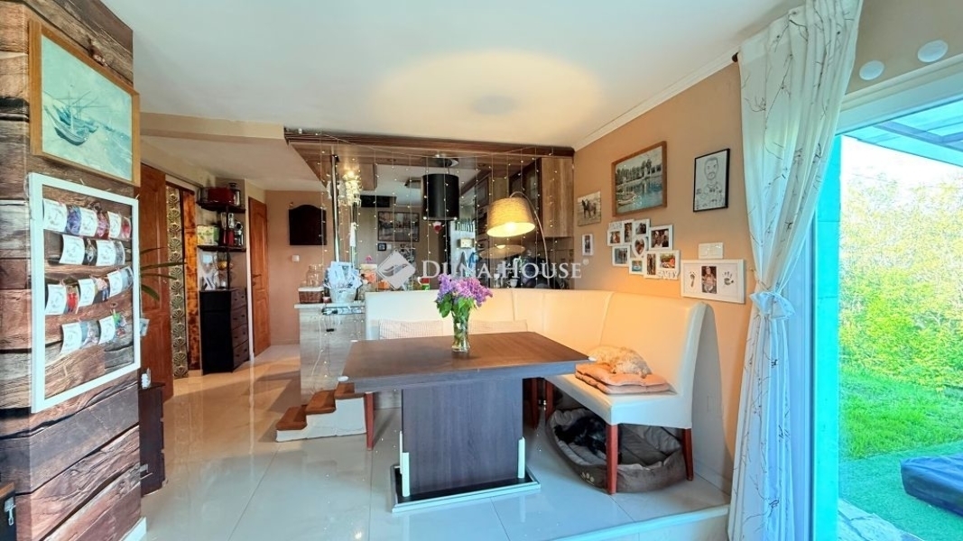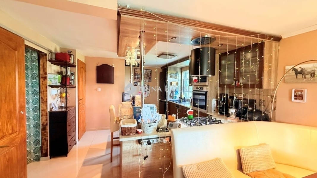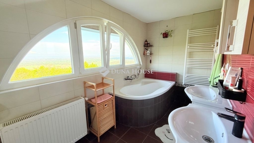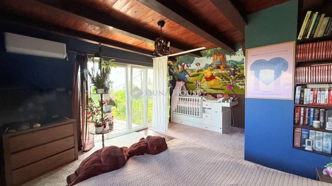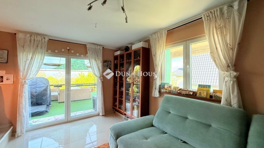 A földszinten az előszobába, majd onnan az étkezős konyhába jutunk. A nappalit egy duplaszárnyú terasz ajtóval akár egybenyithatjuk a kb. 40 nm-es fedett terasszal. Semmi nem zavarja a pazar kilátást. Található még itt egy zuhanyzós fürdőszoba is. Lépcsőn jutunk a tetőtérbe, ahol az átalakítást követően egy kellemes méretű hálószoba terasszal, egy nagy méretű fürdőszoba, a közlekedőben gardrób, és egy gardrób/tároló/dolgozó került kialakításra. Igény esetén két hálószoba is megoldható. Mindenhonnan hatalmas, egyedi ablakokon keresztül csodálhatjuk a kilátást.