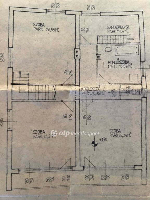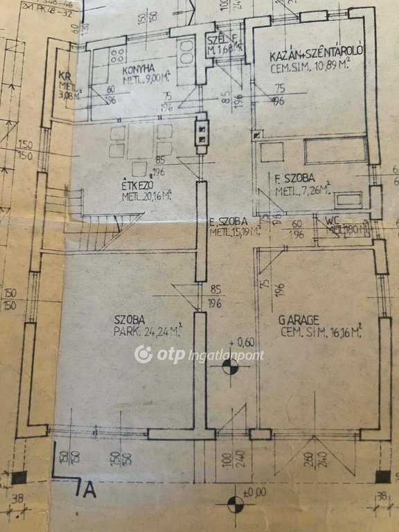 A földszint 100 m2: hatalmas nappalival, két szélfogóval, közlekedővel, folyosóval, fürdővel, külön WC-vel, konyhával, étkezővel, kamrával, kazánházzal és egy 17 m2-es garázzsal.