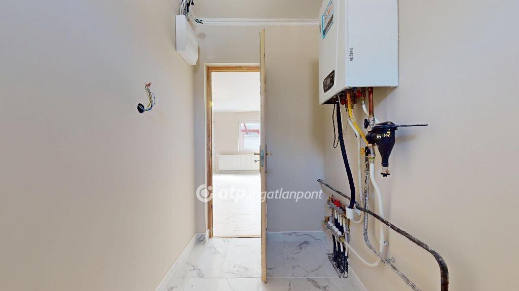 Az elektromos hálózat teljesen új, 3 fázissal kiépítve. A fűtés modern kombi kazánról működik, a csövezés az aljzatban fut, radiátoros hőleadással.