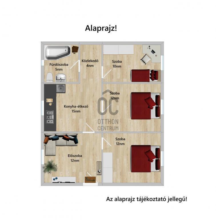 Helyiségek: 3 külön nyíló szoba, nappali, konyha, fürdőszoba
