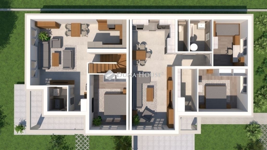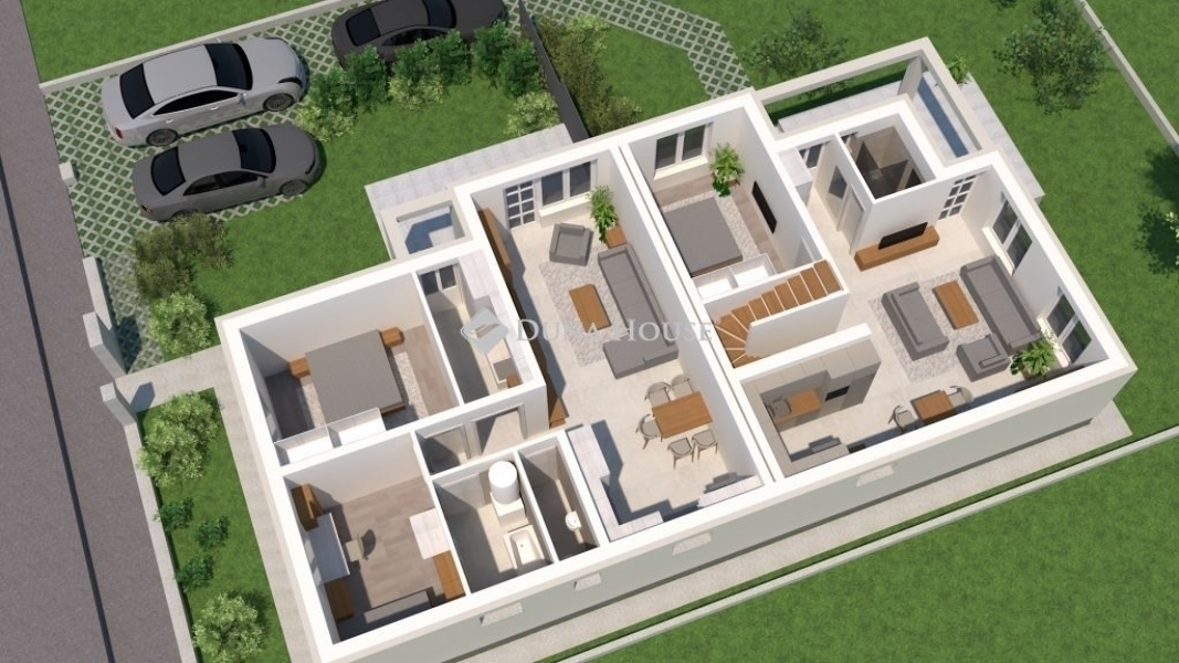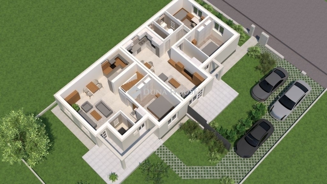 Eladó ez a kivételes, új építésű, egy szintes, 72 nm-es iker családi ház első része, amely egy kb. 220 négyzetméteres telken helyezkedik el.