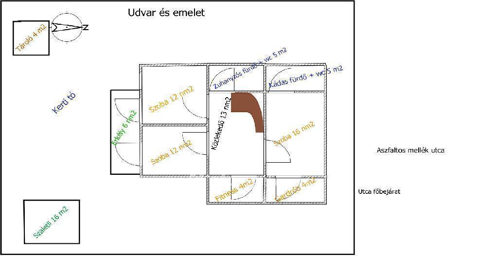 - Elrendezés földszint: amerikai konyhás nappali, előszoba, közlekedő, vendég WC, garázs.