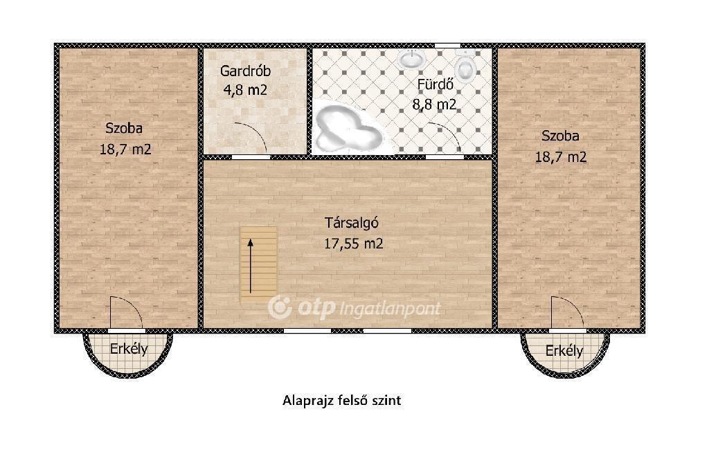 Az alsó szinten a tágas amerikaikonyhás nappalin kívül hálószoba is található, a felső szinten világos társalgó/nappali és 2 szoba került kialakításra.