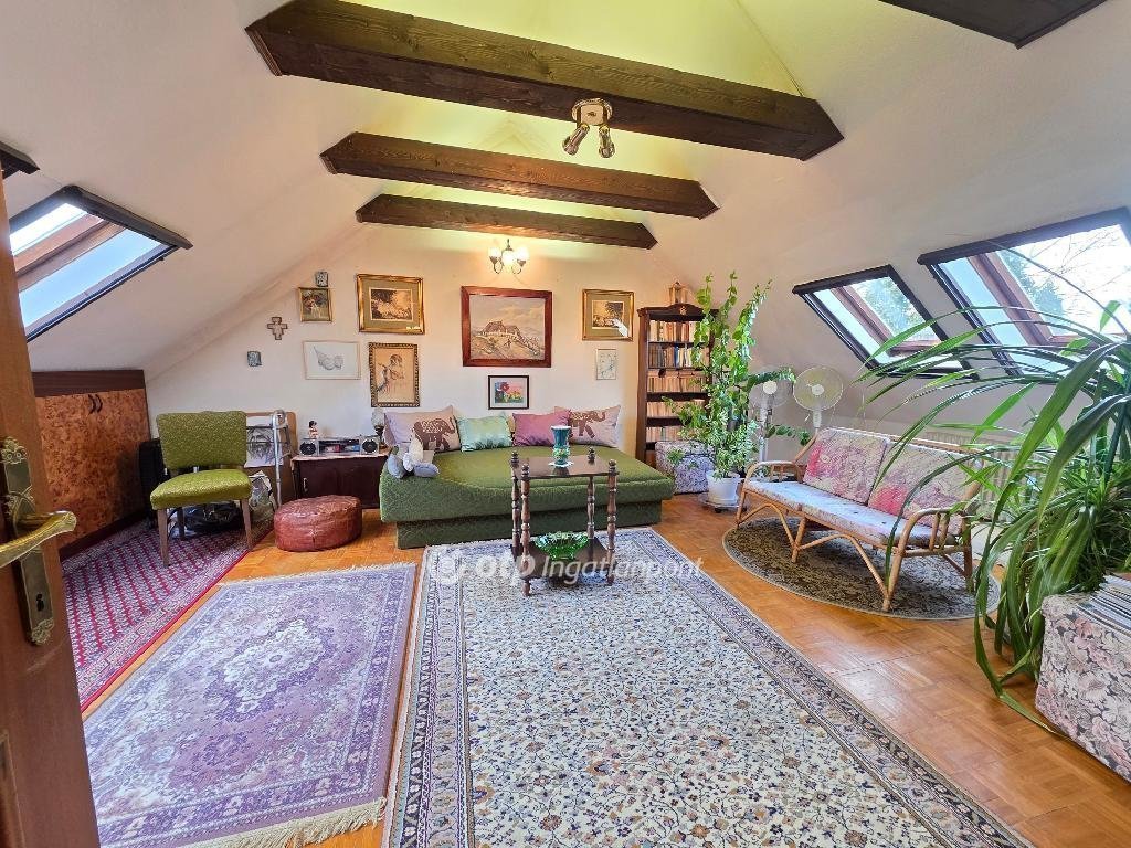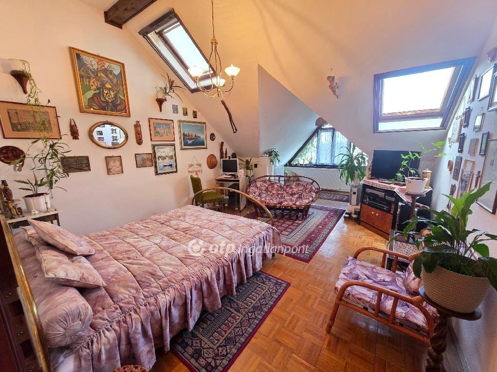 Emeleten 2 napfényes szoba, mely az előkertre és a hátső kertre néz, illetve a tetőtér is be van épitve, ahol szintén egy szoba található.