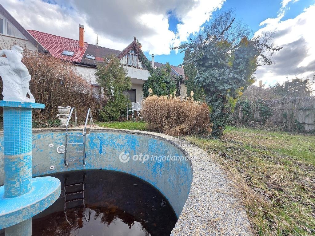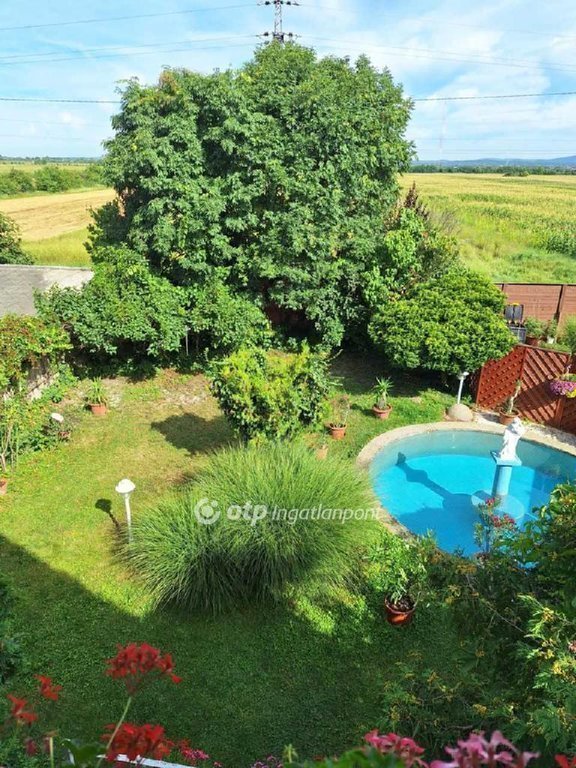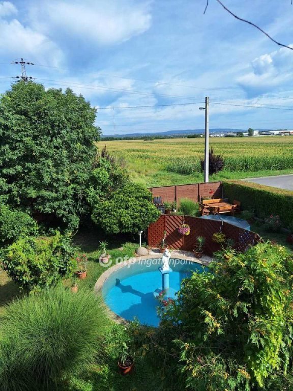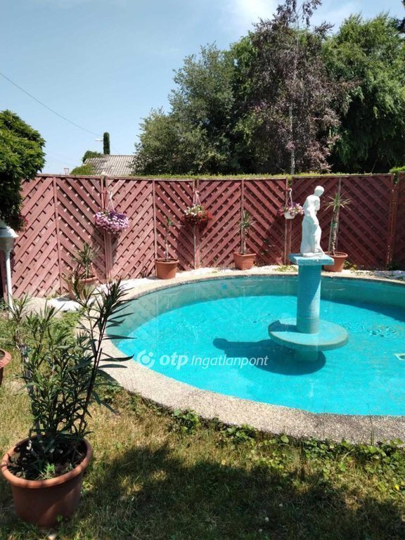 Az utca felőli és a hátsókert is parkosított, virágokkal beültetett, a hátsókertben sütő és medence lett kialakitva.