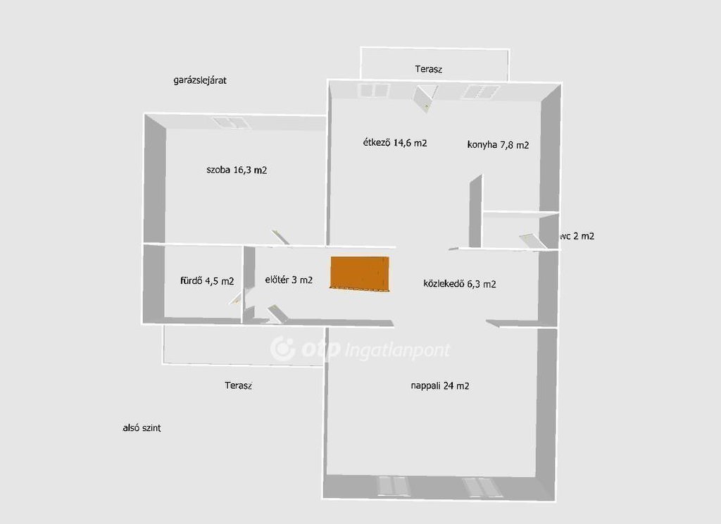 Az alsó szinten található 3 szoba, azaz nappali és konyha, külön szalon vagy szobaként funkcionáló helység és dolgozó szoba vagy hálószoba.