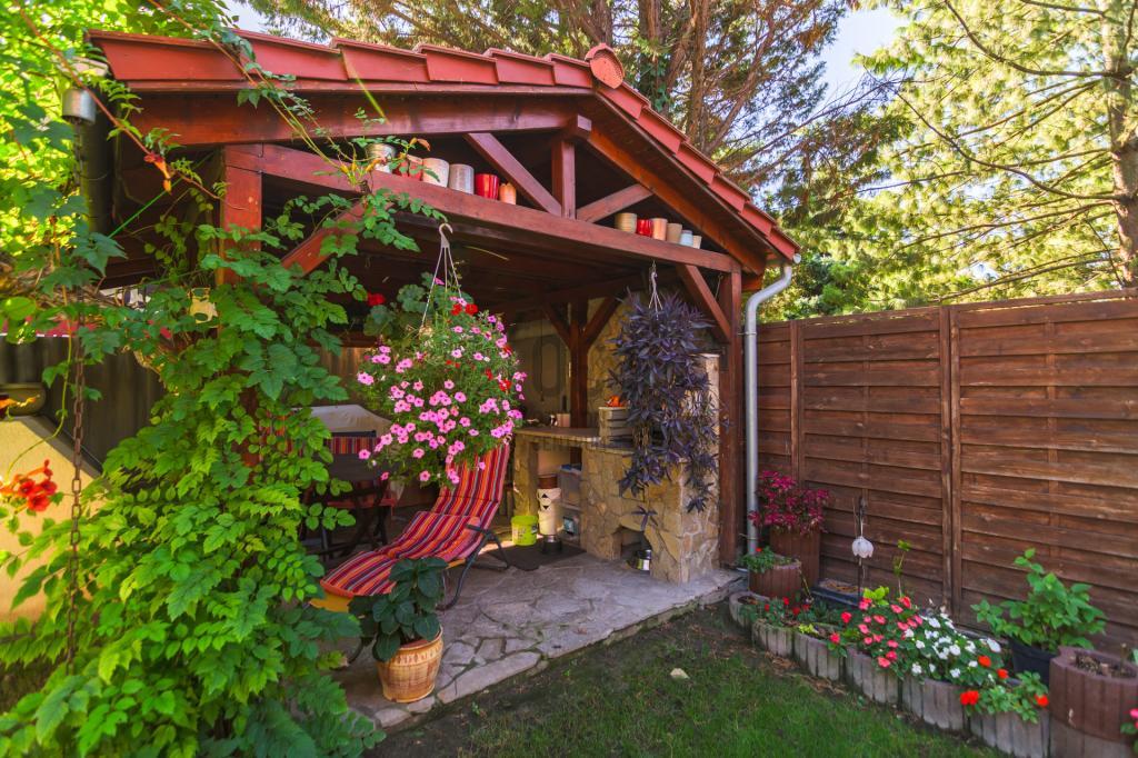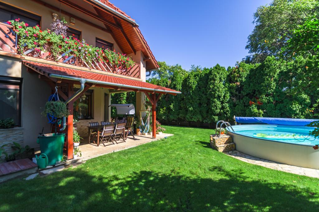 A gondozott kert igazi pihenőkertként funkcionál: privát medence, fedett grillterasz, zöldfelületek és virágos növényágyások teszik teljessé a kertvárosi életérzést. A kertben egy különálló faház-tároló is megtalálható, ideális kerti eszközök vagy szezonális holmik elhelyezésére.