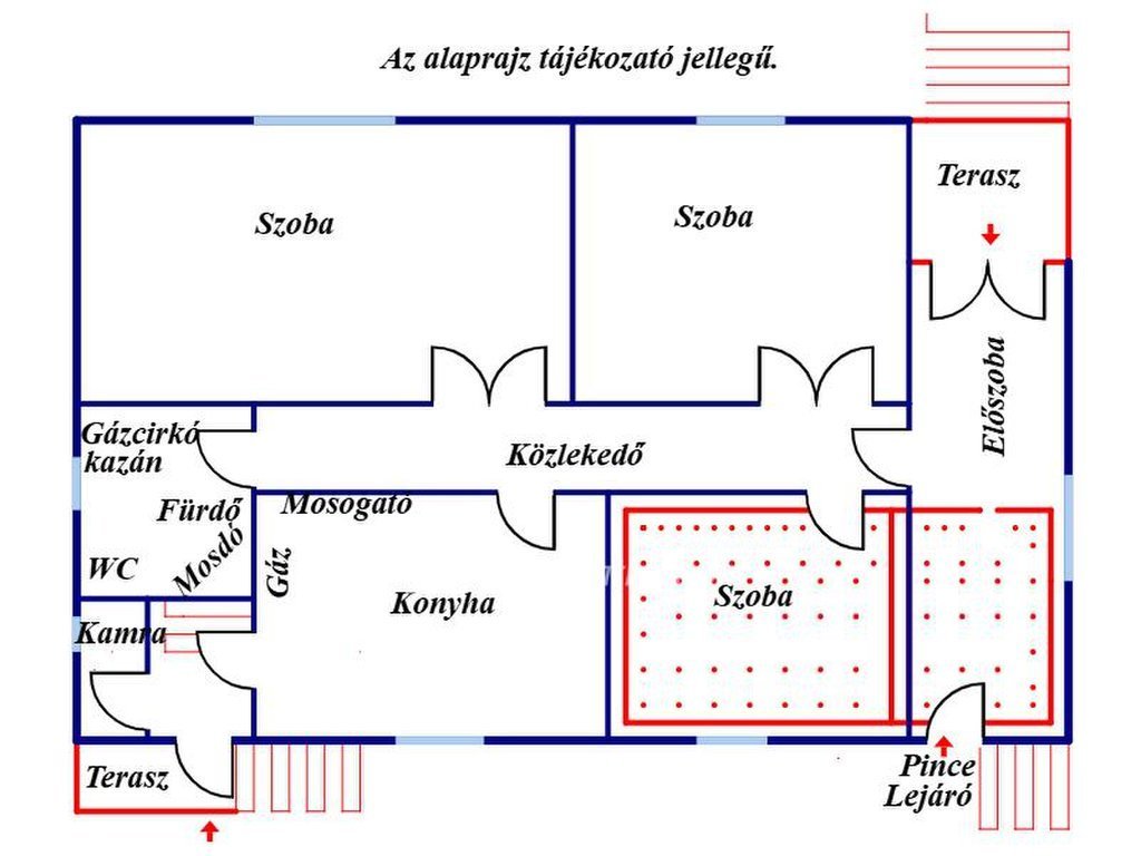 -kettő bejáratú (első, hátsó), ennek megfelelően kettő teraszos és kettő előszoba lett kialakítva,