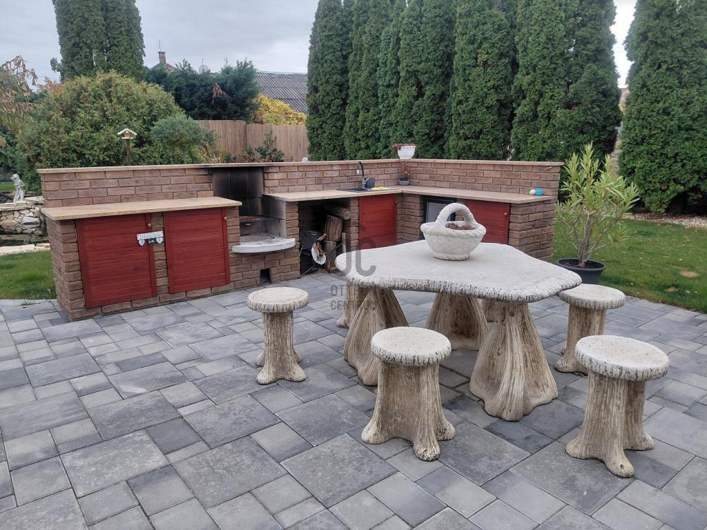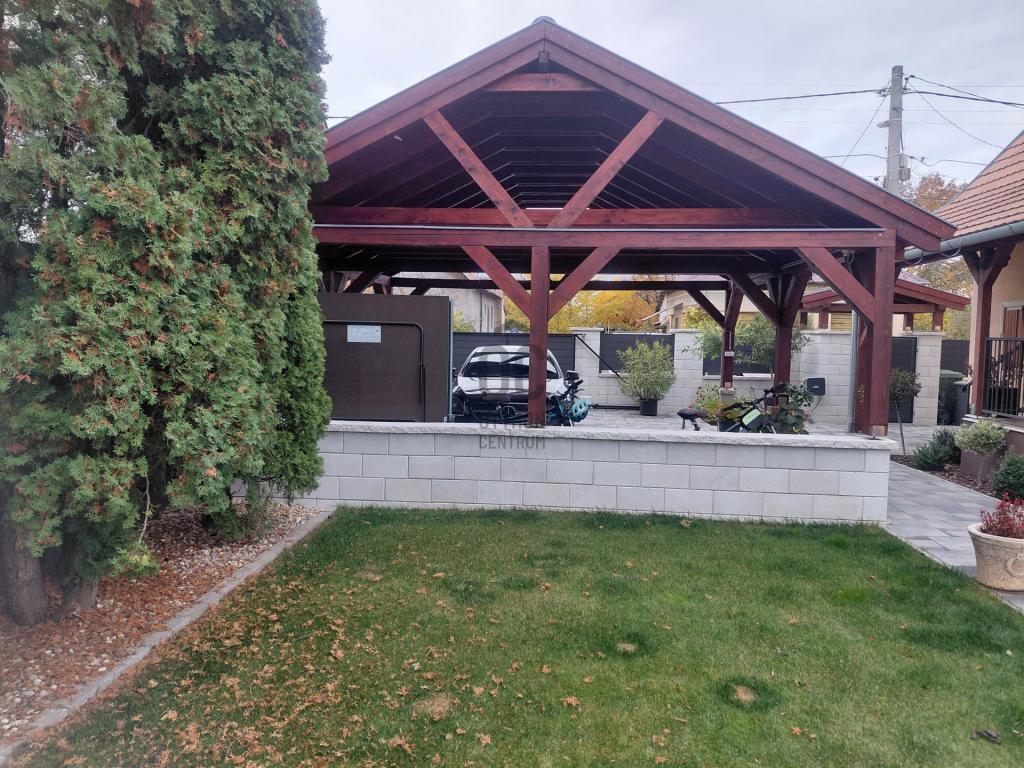 A ház előtt 2024-ben készült automata kapuval ellátott dupla autóbeálló és térkövezett parkoló.
