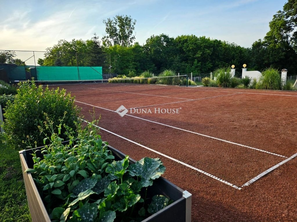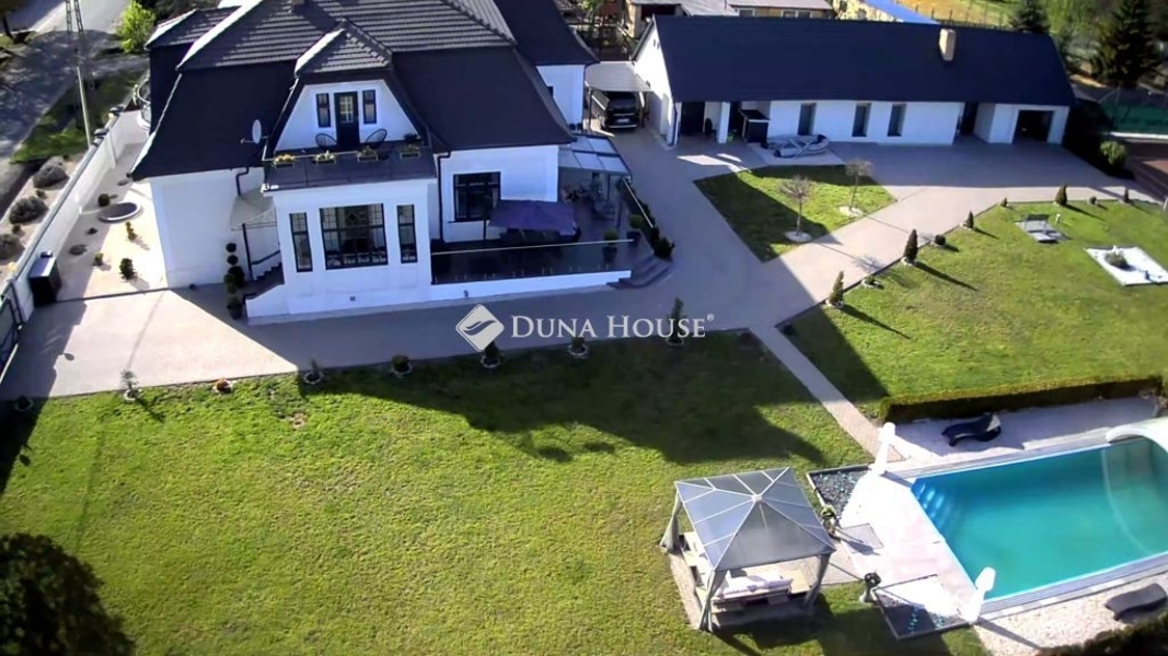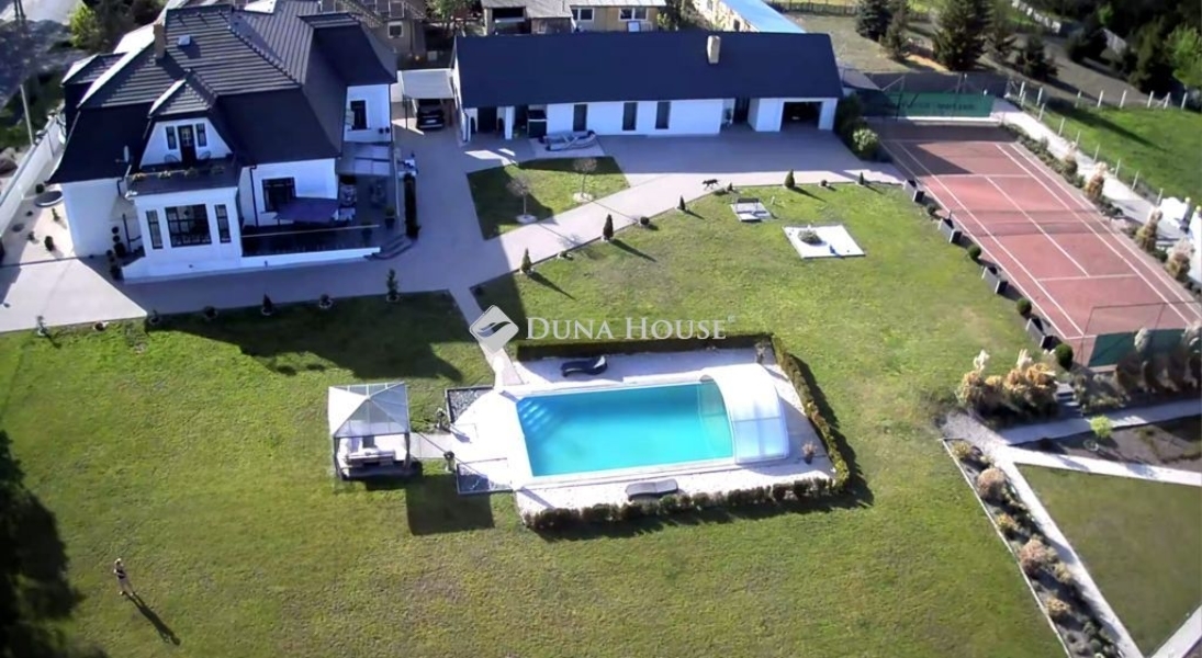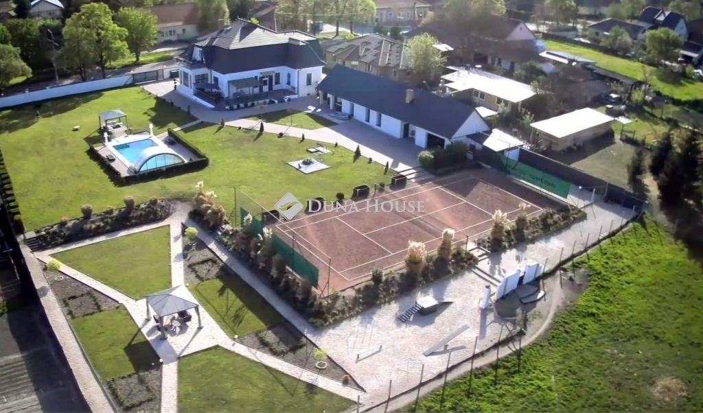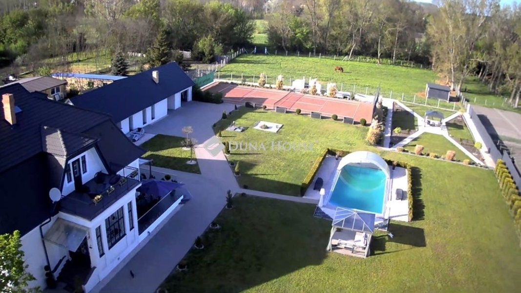 Csúcsmodern, tekintélyes villa gyönyörűen parkosított kerttel, teniszpályával, medencével, wellness részleggel, edzőteremmel és ló kifutóval, 25 percre a budapesti repülőtértől.