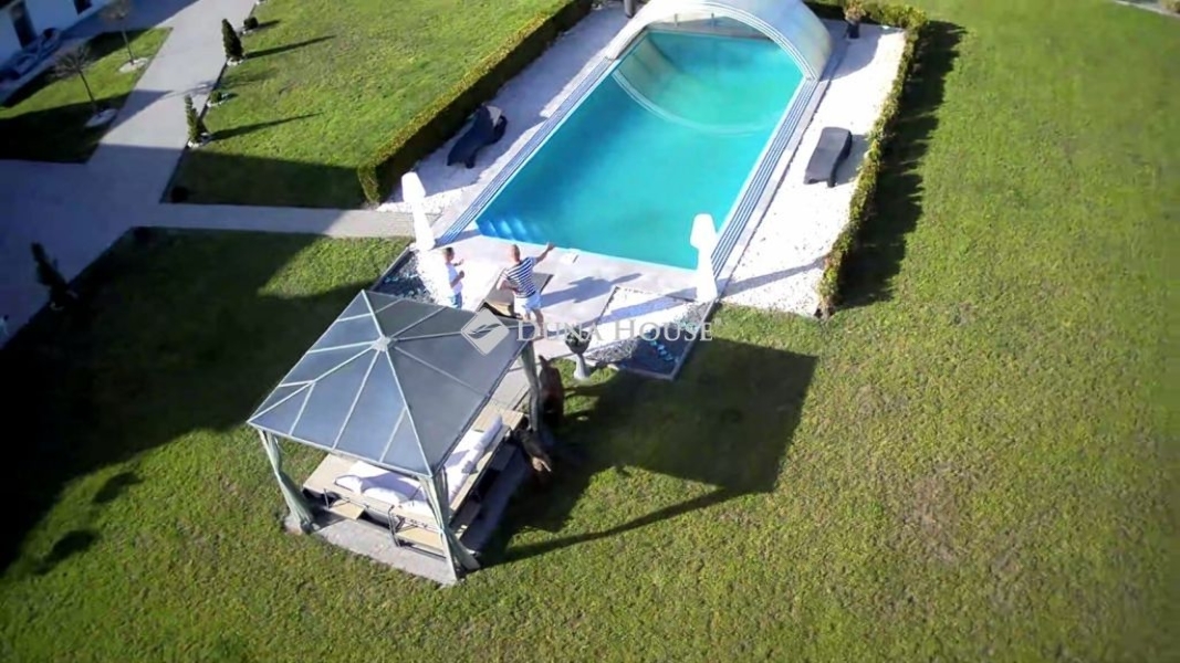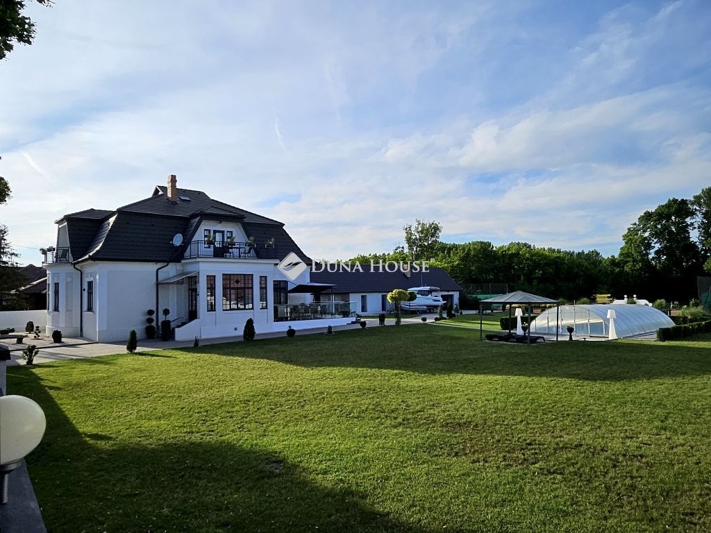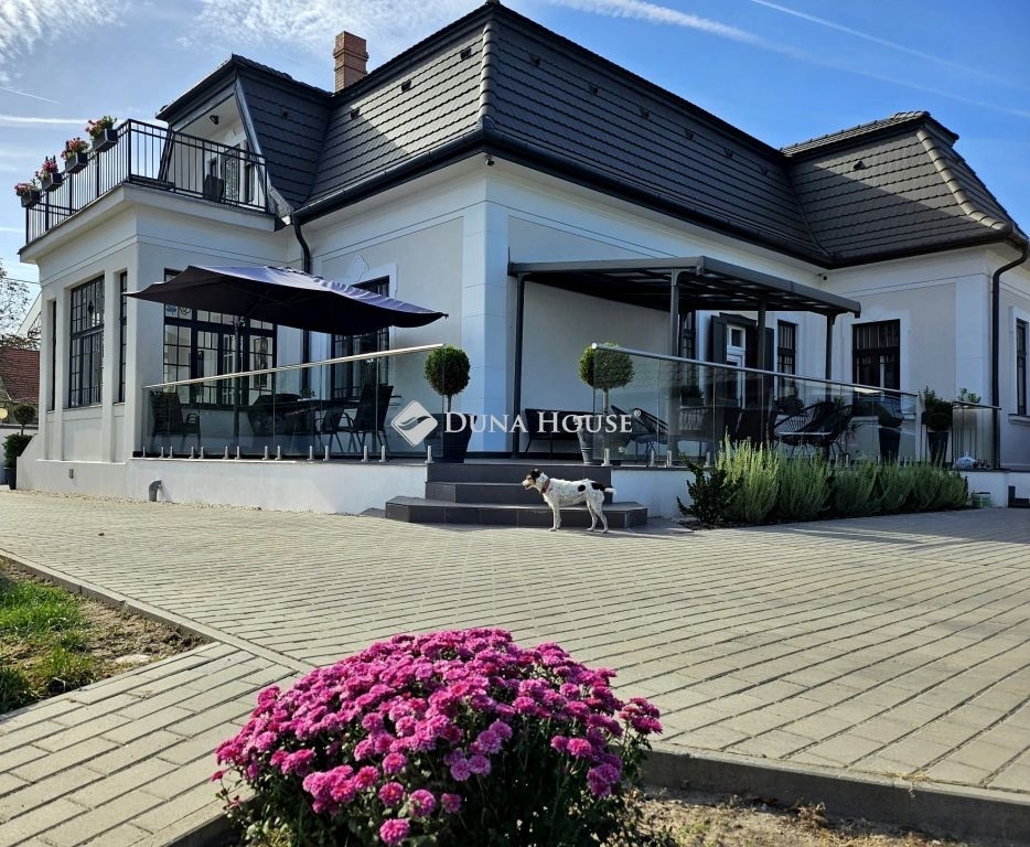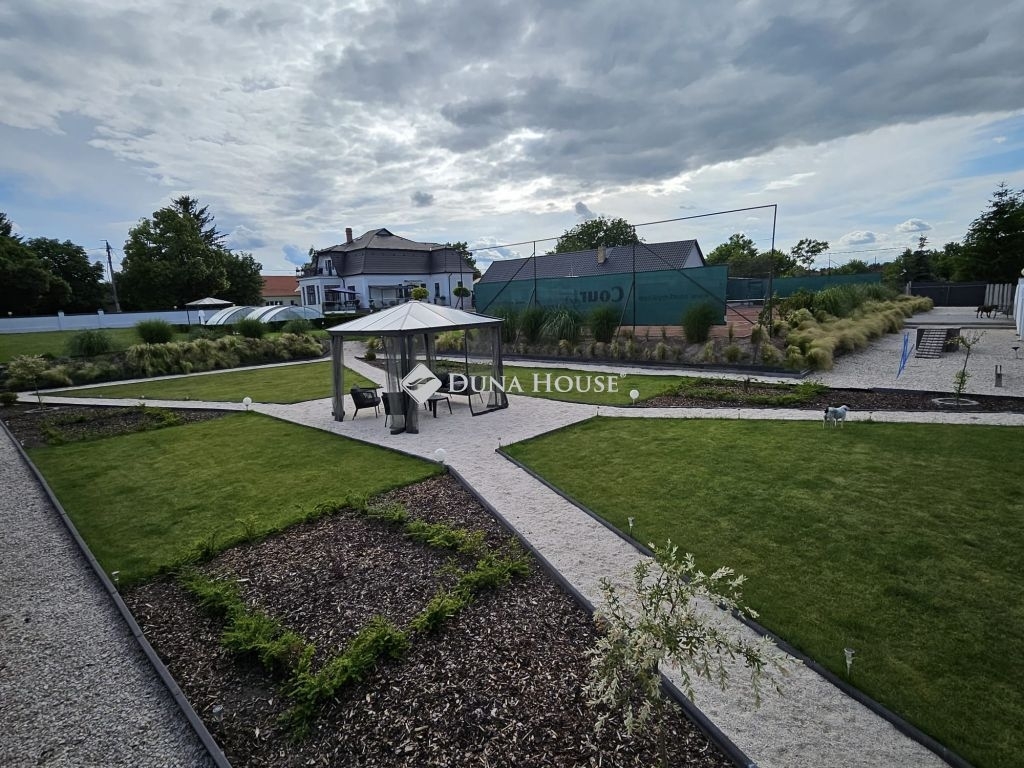 Csúcsmodern, tekintélyes villa gyönyörűen parkosított kerttel, teniszpályával, medencével, wellness részleggel, edzőteremmel és ló kifutóval, 25 percre a budapesti repülőtértől.