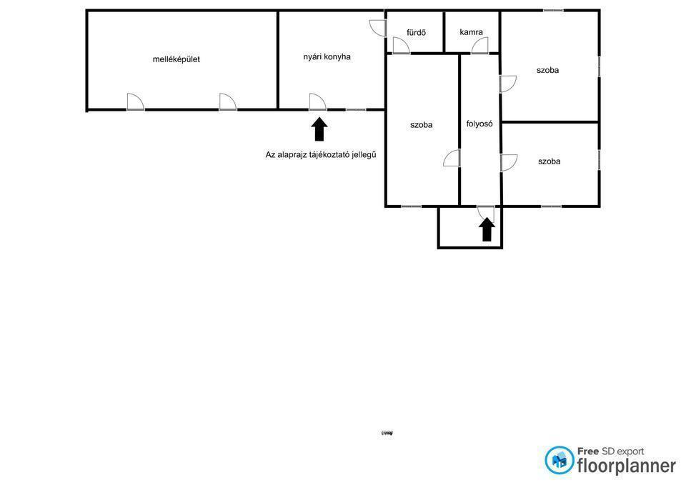 A házban egy előszoba, 3 szoba, közlekedő, konyha+étkező, fürdő, mosdó és kamra található.