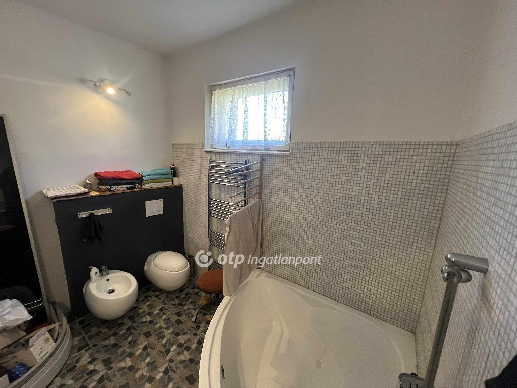 A fürdőszoba modern felszereltségű: sarokkád, bidé, mosdószekrény, WC, valamint zuhanyzó-előkészítés található benne. A fűtés kombi gázcirkóval megoldott, radiátoros és padlófűtéses hőleadással, a fürdőben törölközőszárító radiátor biztosítja a kényelmet. A házban LED világítás és kamerarendszer is kiépítésre került.