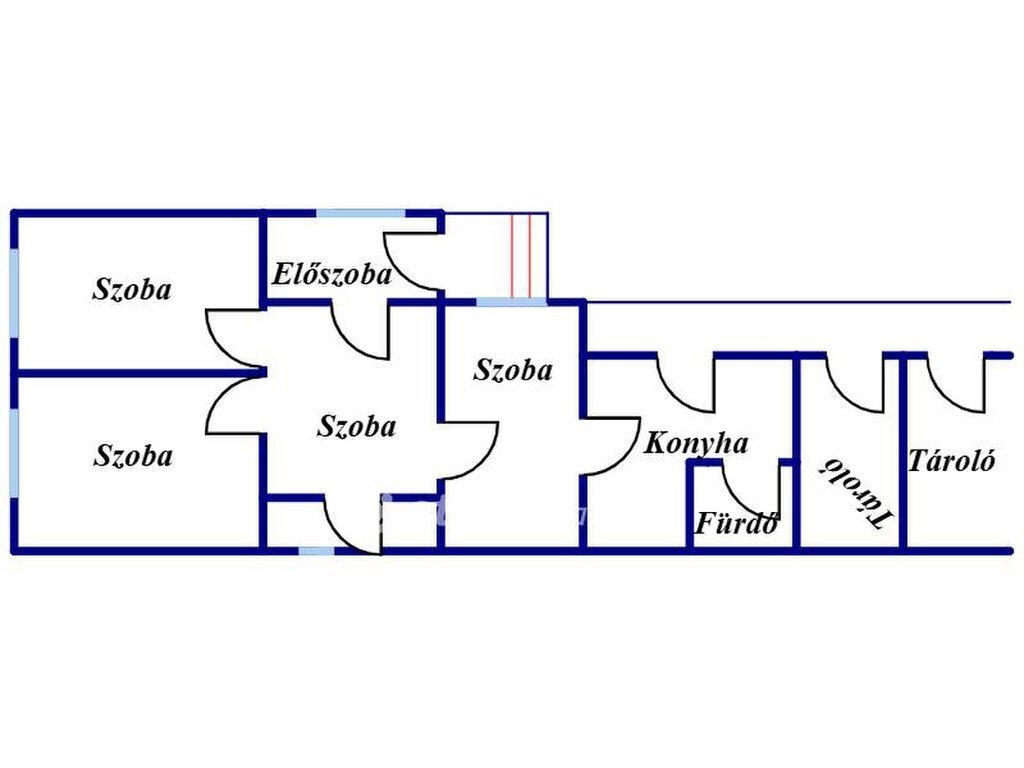 Utcafronti nézetű 2 db 16 nm külön nyíló szoba, 1 nappalinak használható szobából közelíthető meg és 1 félszoba, konyha irányában, kamra, előszoba, fürdőszoba és WC egyben.