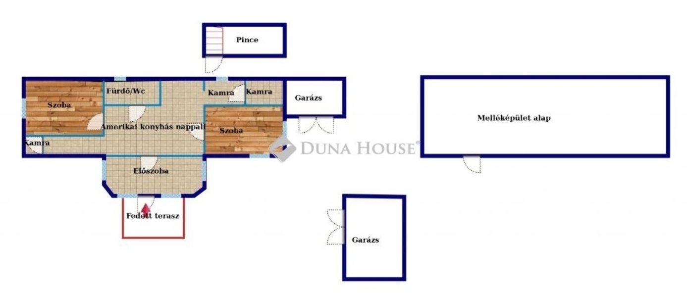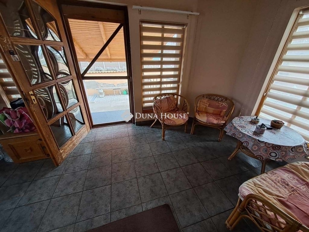Az épület elosztása kitűnő: Fedett teraszon keresztül lépünk be a tágas előszobába. Innen az amerikai konyhás nappaliba jutunk - itt a konyhabútor az ár részét képzi. Szemben egy fürdő/mosdó helyiség lett kialakítva, ahol zuhany és kád is kiépítésre került. Balra a nagyobb szoba található, mellette pedig egy kisebb kamra. A nappali jobb oldalán egy másik nagy szoba került kialakításra, mellettük pedig 2 db kamra. (ezek alatt pince helyezkedik el). Az épülethez hozzáépítve egy garázst is találunk, valamint még egy nagyobb - mobil garázs is kialkításra került.