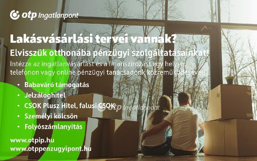 A vásárlás finanszírozásában az OTP kedvező hitelkonstrukcióival, CSOK és a támogatott hitel lehetőségével, vagy akár a babaváró hitel ilyen célra történő felhasználásával tud segíteni. Használja ki a lehetőséget, hogy kedvezőbb kamatozású OTP Bank hitelhez juthat, ha az OTP Ingatlanpont kínálatából vásárol. Ingatlant kereső ügyfeleink részére szolgáltatásaink és az ingatlanvásárlással, ingatlan felújítással kapcsolatos hitel ügyintézése ingyenes. Az adás-vétel lebonyolításához korrekt ügyvédi közreműködést tudunk ajánlani. Érdeklődés esetén várom hívását akár hétvégén is! Hibás hirdetés bejelentése