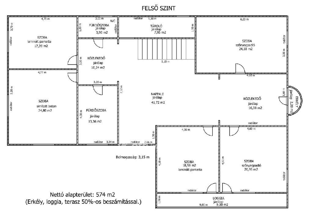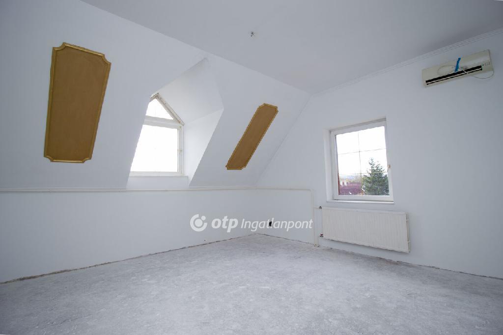 Felső szinten: Öt tágas szoba, nagy méretű nappali, kettő fürdőszoba, két erkély, lépcsőház és tároló helység.