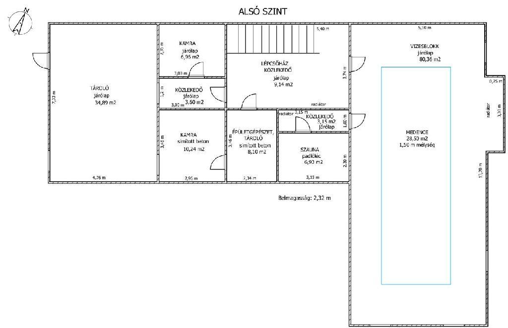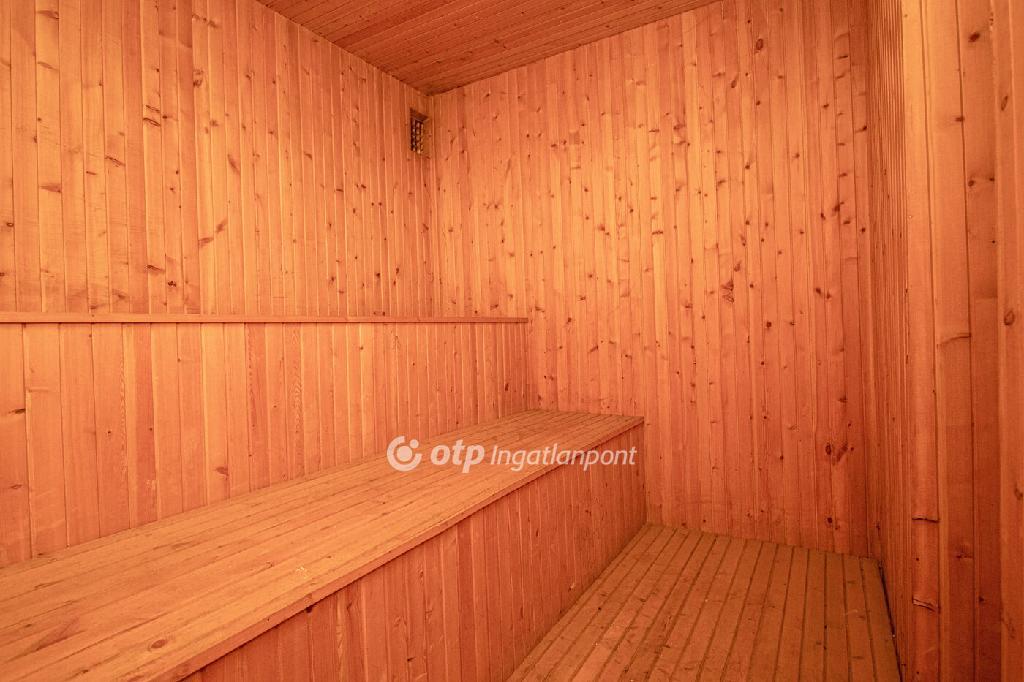 Az alsó szinten található: medence, 12 fős szauna, épületgépészet és sok tárolóhelyiség.